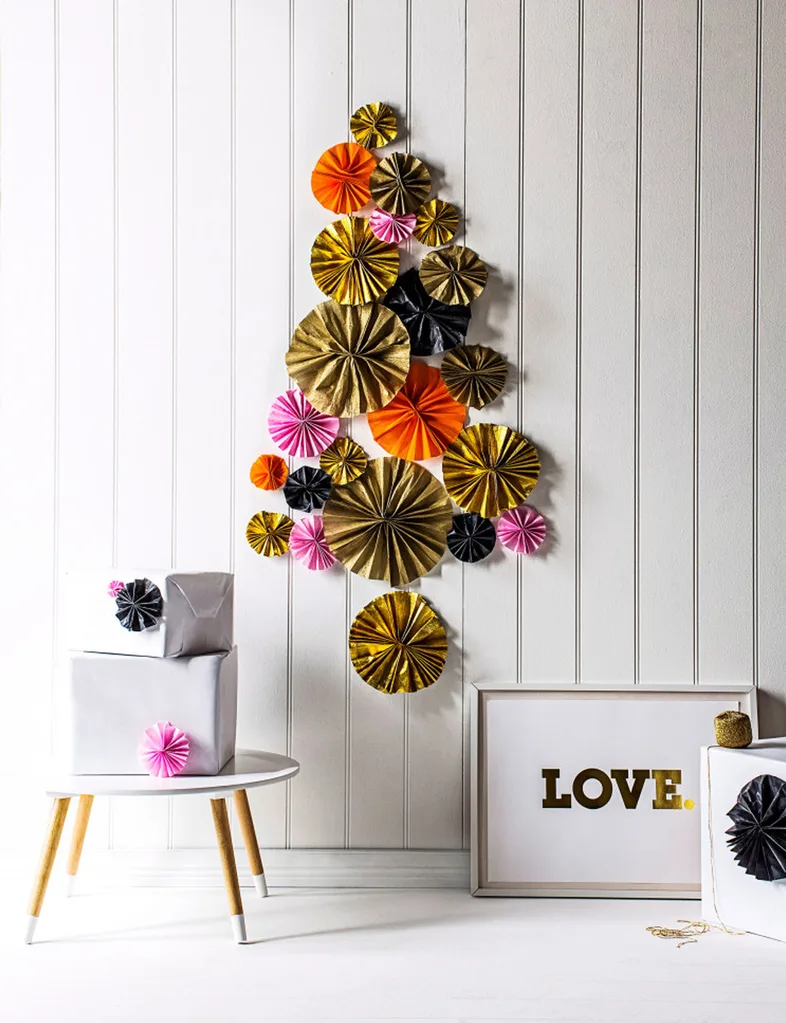 To make this tree, you’ll need paper in gold and other assorted colours such as black, pink and orange. Simply fold a long rectangle of paper into zigzags (start at the short end and fold down the length of the paper). Fan paper out into a circle shape and join ends together with a few staples, then simply Blu Tack each rosette to the wall.