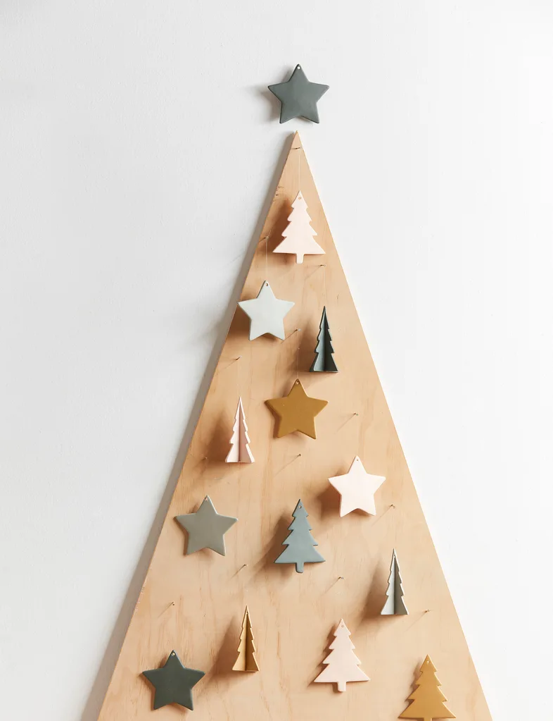 Take a standard sheet of ply and draw a triangle on it from the top to the bottom. Saw off the sides and sand the edges smooth. Hammer small nails partway into the ply for hanging decorations.