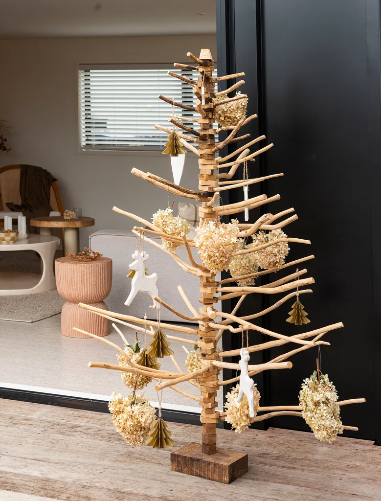 The driftwood arms of the tree offer great perches to hang decorations from. If you want to stick with the beach theme, hang dried flowers and wooden decorations in a tonal colour theme from the branches.