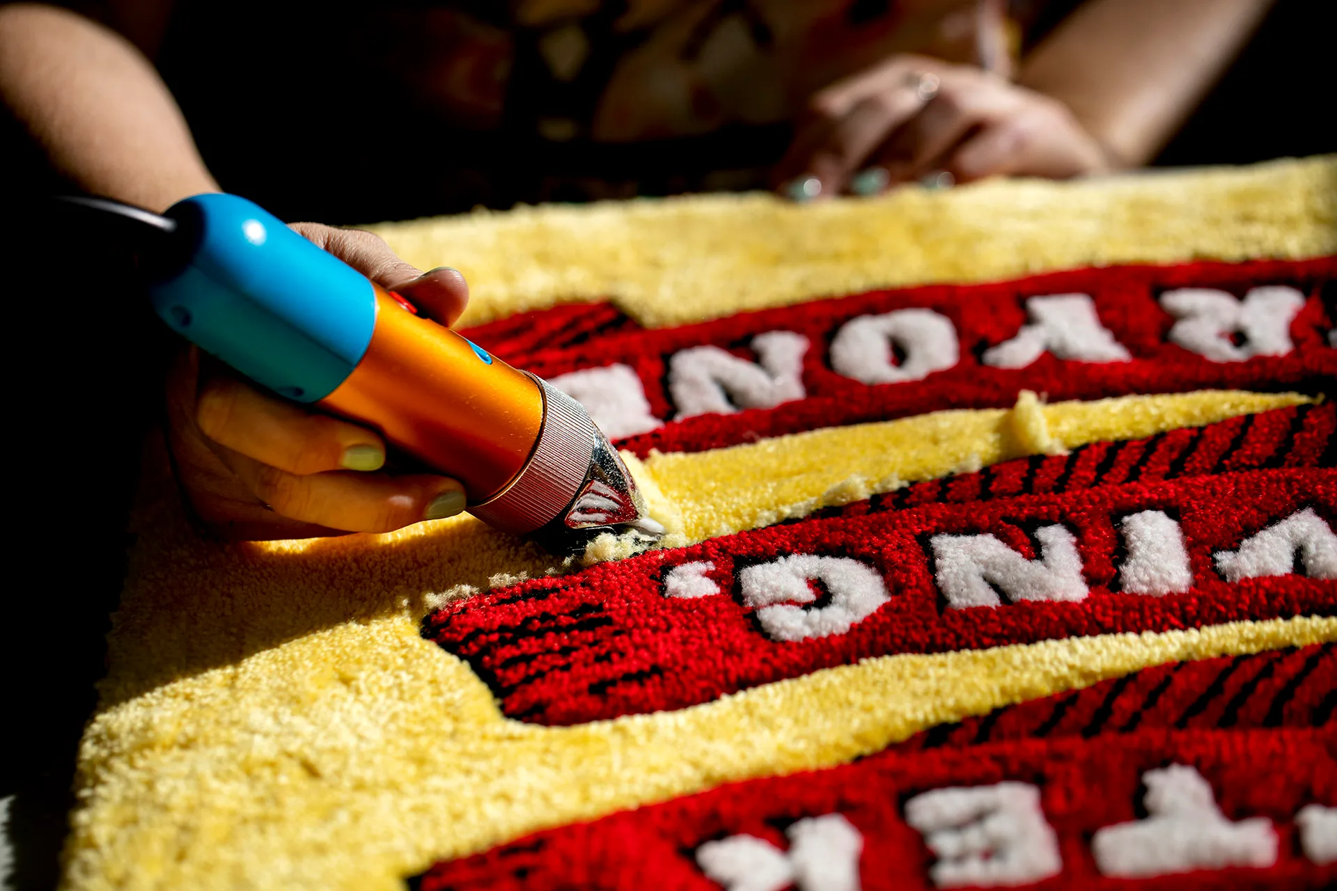 I create a design, stretch some fabric onto a frame, then draw the design on it. Rug tufting is like painting with wool using a gun, so I fill in the design by threading yarn into a tufting gun and shooting that into the fabric. Once that’s done, I tidy up any stray bits or mistakes, then cover the back of the rug with latex glue to hold the yarn in place and add a backing. Rugs look best when they are sheared to even them out, then carved with scissors to get nice clean lines. The whole process takes quite a while.