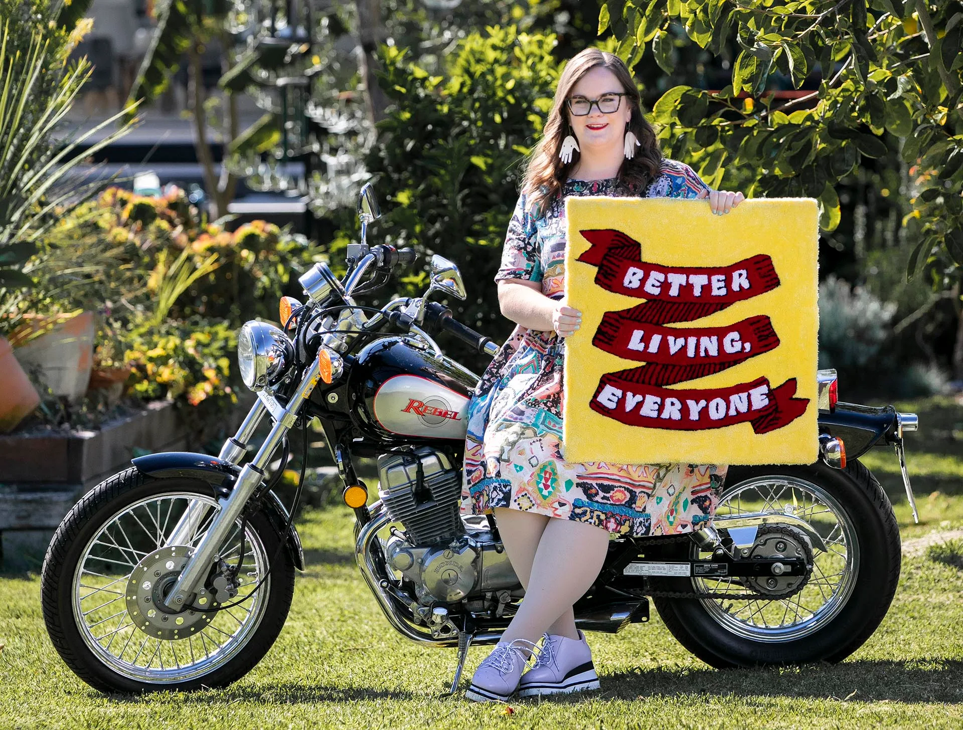 Feeling positive about my body can be a bit of a stretch sometimes, so I’m working on feeling neutral about it and finding gratitude in what my body allows me to do. For example, hugging my friends, riding my motorbike to beautiful places, eating mint chocolate-flavoured ice cream, getting goosebumps when listening to music that moves me, and yes, creating rugs with glorious bums on them.