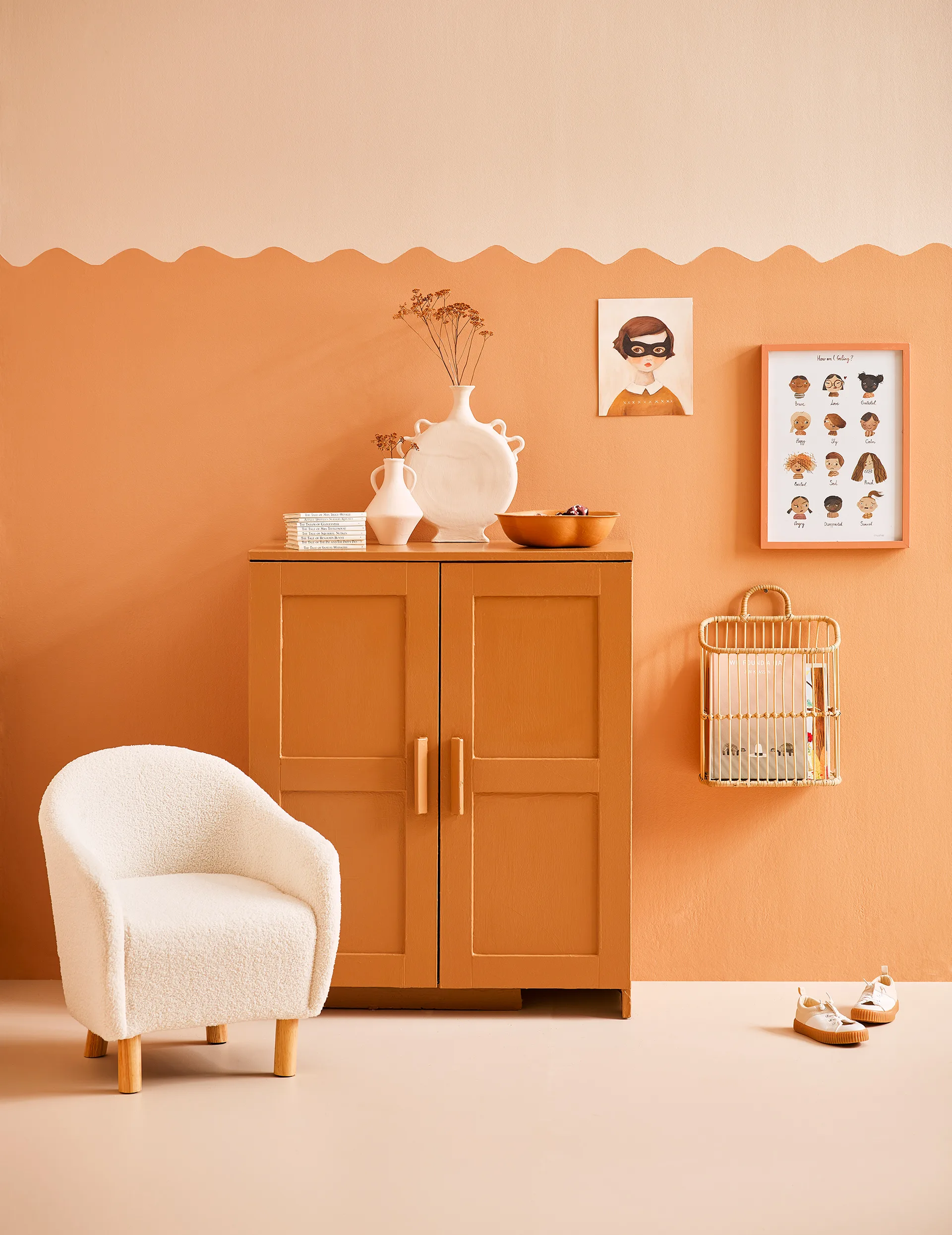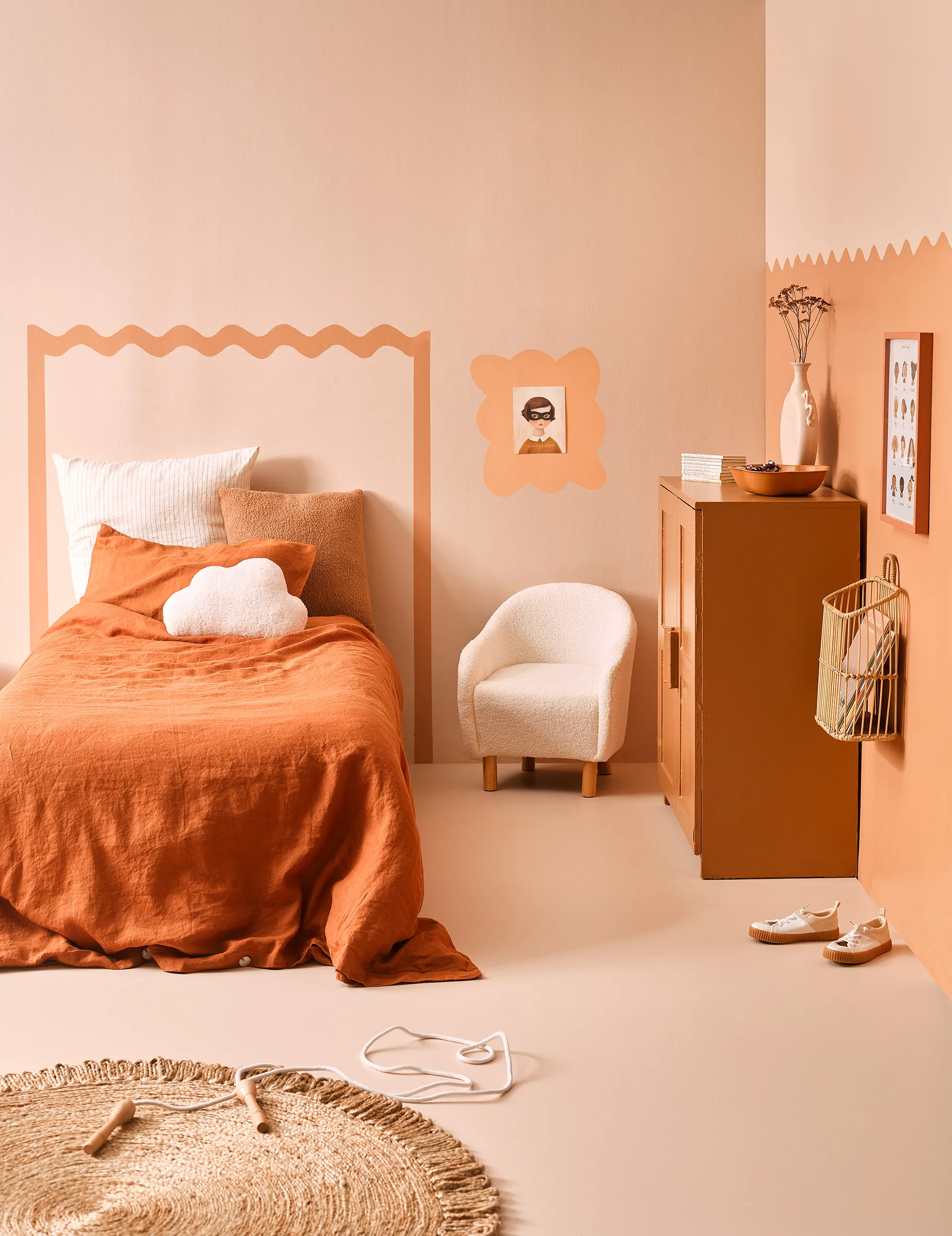 Paired with this charming design is another very on-trend look; tonal terracotta. Using a palette of Resene Bone, Resene Kalgoorie Sands, Resene Beethoven and Resene Just Right paired with natural materials and pockets for fresh white accents, this squiggly-inspired space becomes a warm and inviting room that will see your child through from toddler to teenager.