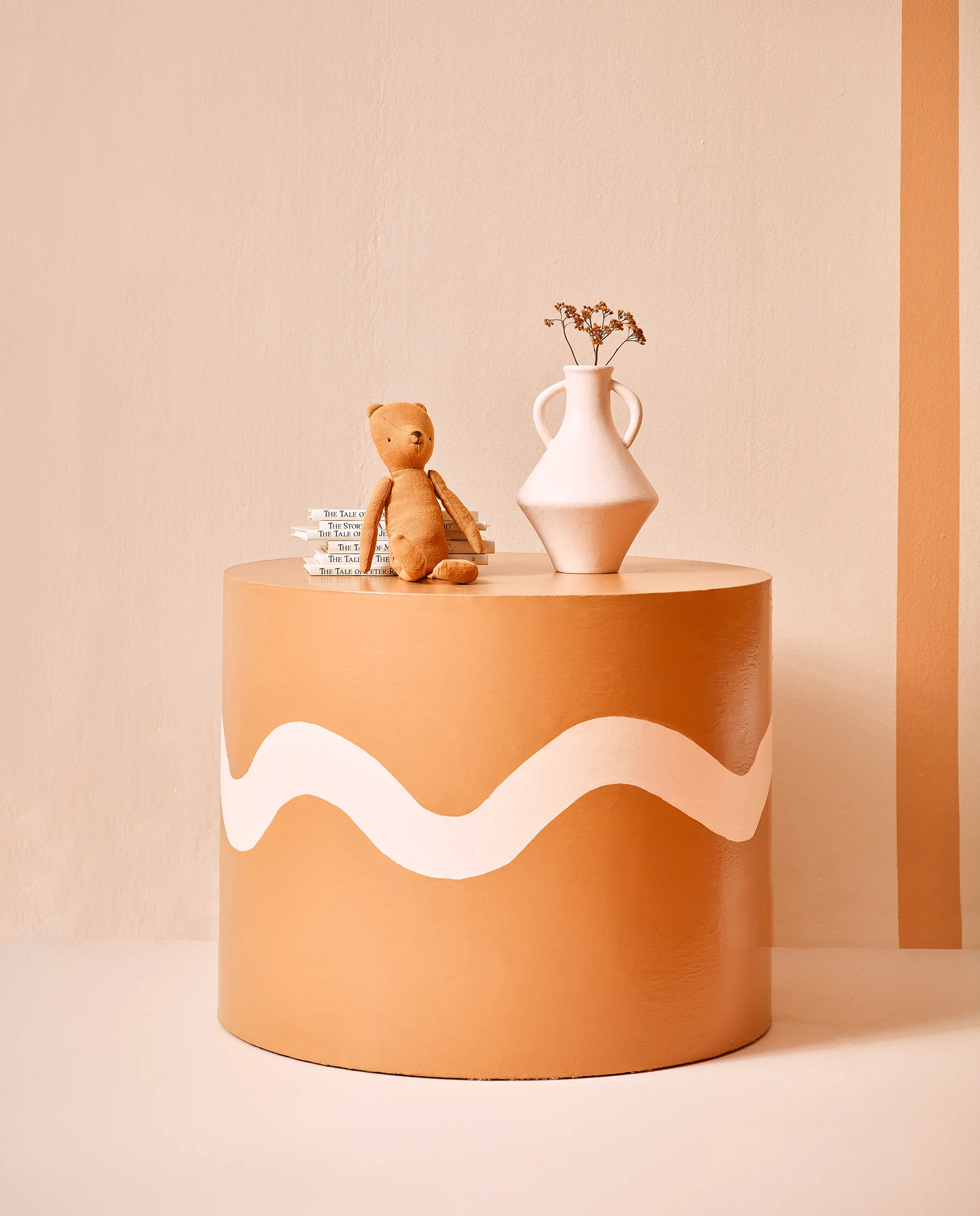 For a squiggly, liquorice allsorts-inspired bedside table, paint the base in Resene Brown Sugar, allow to dry, then hand paint the squiggle onto the centre using Resene Just Right.