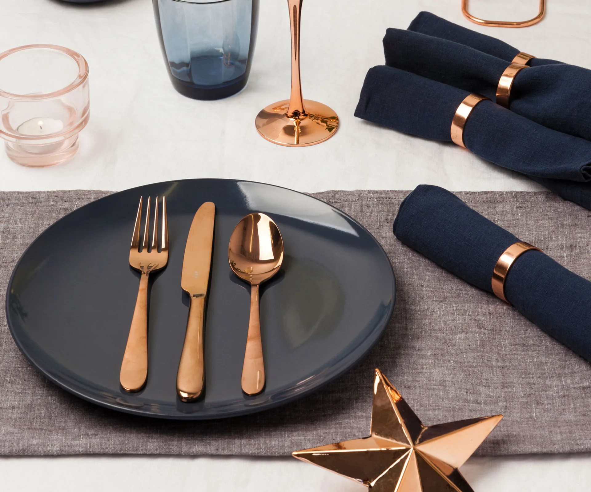 Copper star decoration (set of 2) $12.99 from Ezibuy. Hay lup copper candlestick $103.50 from Cult design. Copper napkin rings (set of 6) $103.50 from Tessuti. Lloyd blue tumbler $7.95, Jett mini bowl in midnight blue (with marshmallow in) $5.95, Jett dinner plate in midnight blue $9.95, Sola candle holder with tea light in $5.95 all from Freedom. Munich Copper knife, fork and spoon $8.99 per piece, Metallico copper stem flute glass $19.90 all from Stevens. Washed linen tea towel in charcoal chambray (under plate setting) $19 from Nest.