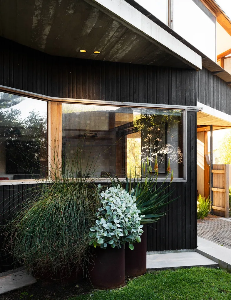 Peace and privacy reign at this coastal New South Wales holiday home, thanks to the prolific gardens that wrap around it. A wall of native Australian shrubbery along the shared driveway shields the house, while trees and grasses provide a soft contrast to the charred-timber exterior. Upstairs, elevated decks and balconies overlook lush canopies, with views of the beach beyond.