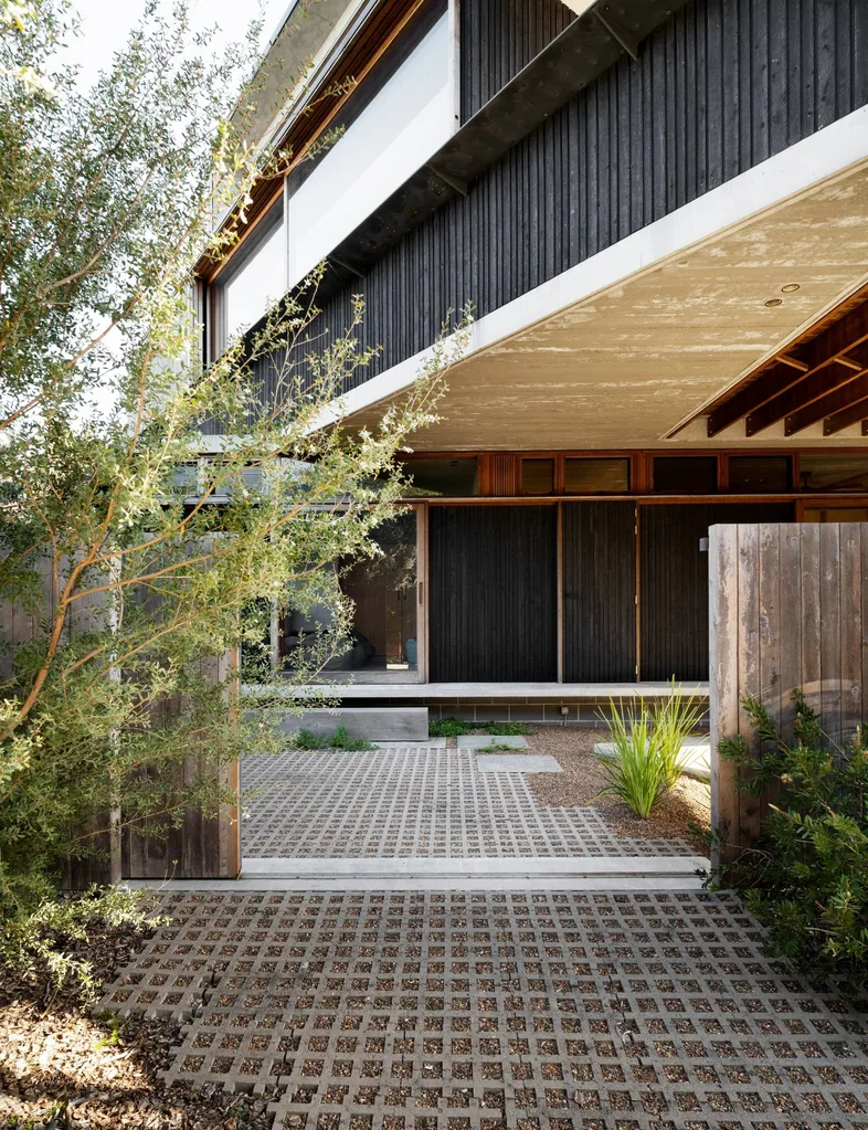 The gardens are designed in response to the main building’s linear form. They assist in maintaining a sense of privacy within the subdivided block. Upon entering through the timber gates, permeable pavers act as a living carport. A garden bed of coastal tea tree (Leptospermum laevigatum) sits to one side, complete with a concrete entry landing on the other. From there, Endicott stone pavers lead to a pebble-lined garden beneath the elevated deck and stairs.