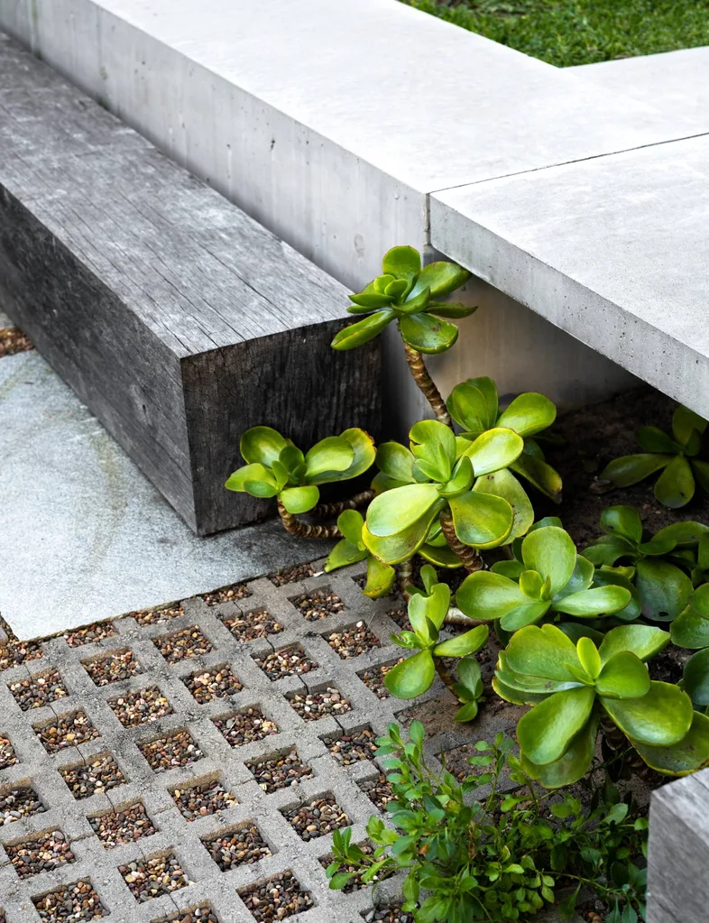 - Growing in a gap beneath the lawn’s concrete threshold is a paddle-shaped succulent. It is accessed by recycled timber sleepers from a wharf.