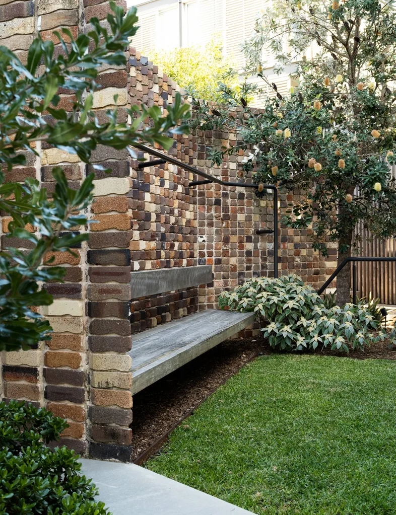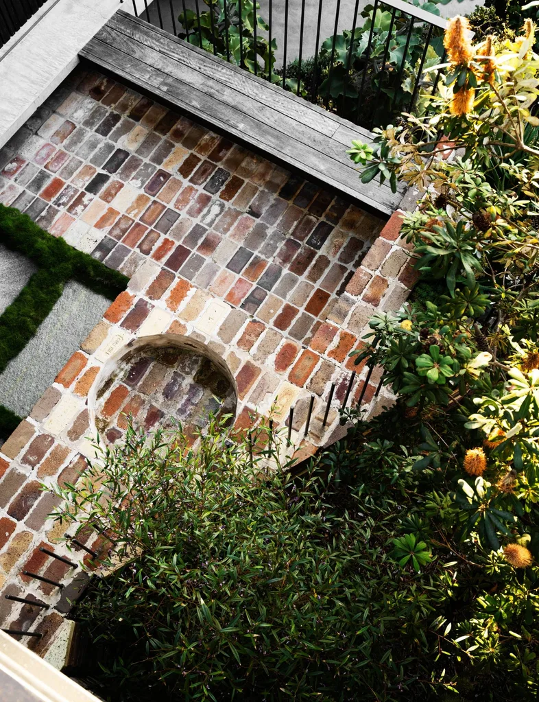 - Looking down into the garden’s recycled-brick fire-pit area with its timber-bench seating and palisade-style safety barrier.