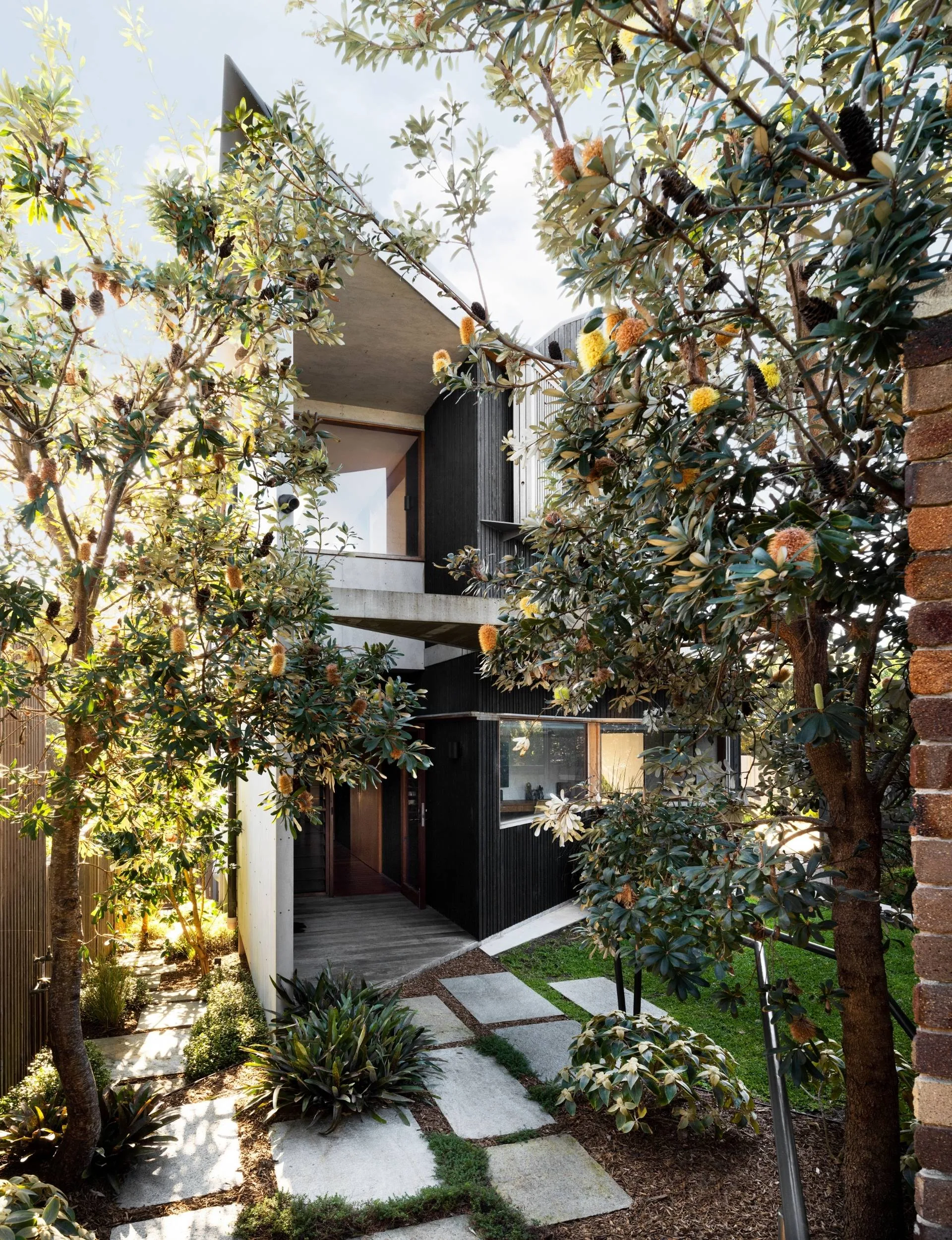 “The aim was to create a sense of entry as soon as you come up the drive, as well as to enhance the sense of greenery when you’re inside looking out,” says landscape designer James Headland about the engaging, all-purpose space that acts as a buffer between the four-bedroom home and its nearby neighbours.