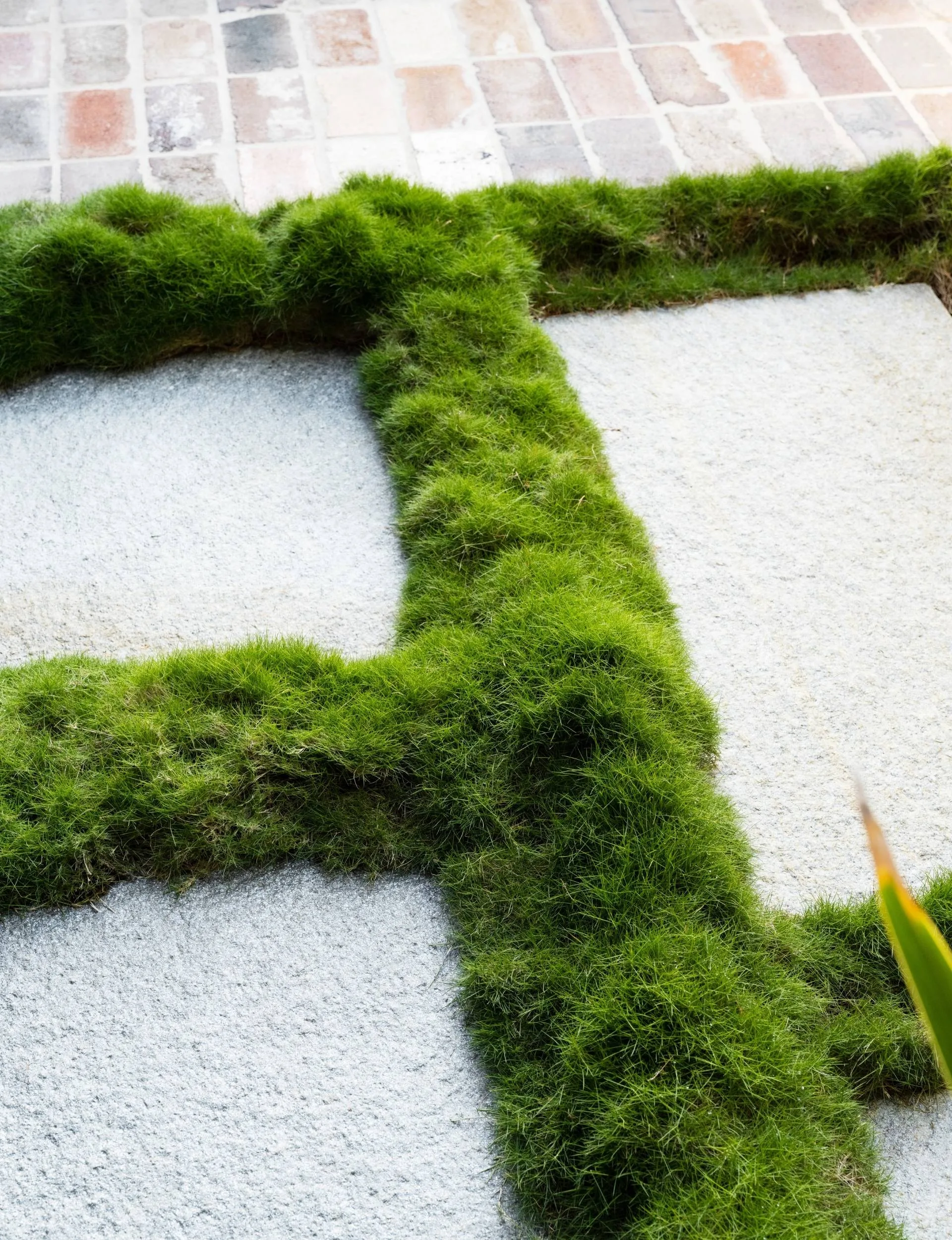 - Fluffy no-mow grass (Zoysia tenuifolia) grows between the large-format Endicott stone pavers in the courtyard area.