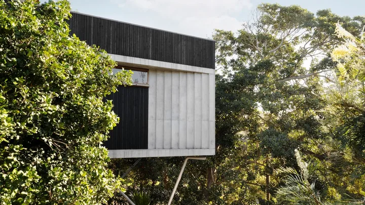 Peace and privacy reign at this coastal New South Wales holiday home, thanks to the prolific gardens that wrap around it. A wall of native Australian shrubbery along the shared driveway shields the house, while trees and grasses provide a soft contrast to the charred-timber exterior. Upstairs, elevated decks and balconies overlook lush canopies, with views of the beach beyond.