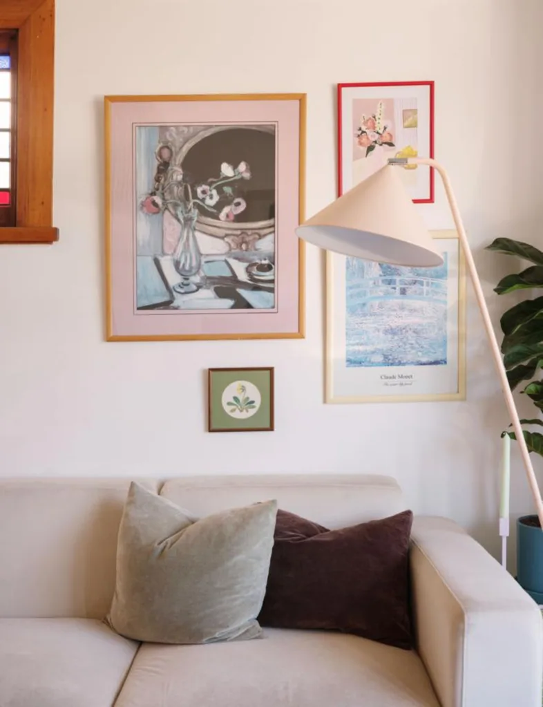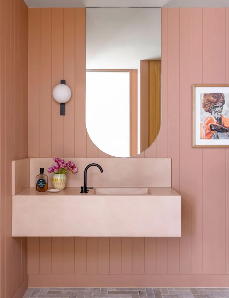 Take this renovated, mid-century beach house, for example. The eye-catching pink, red and blue artwork sets the tone for the entire living room. The cushion and coffee table, – dressed in putty pink and deep blue – echo the tones found in the art. So, next time you stumble upon a piece of artwork you love, study it and use it as colour palette inspiration.