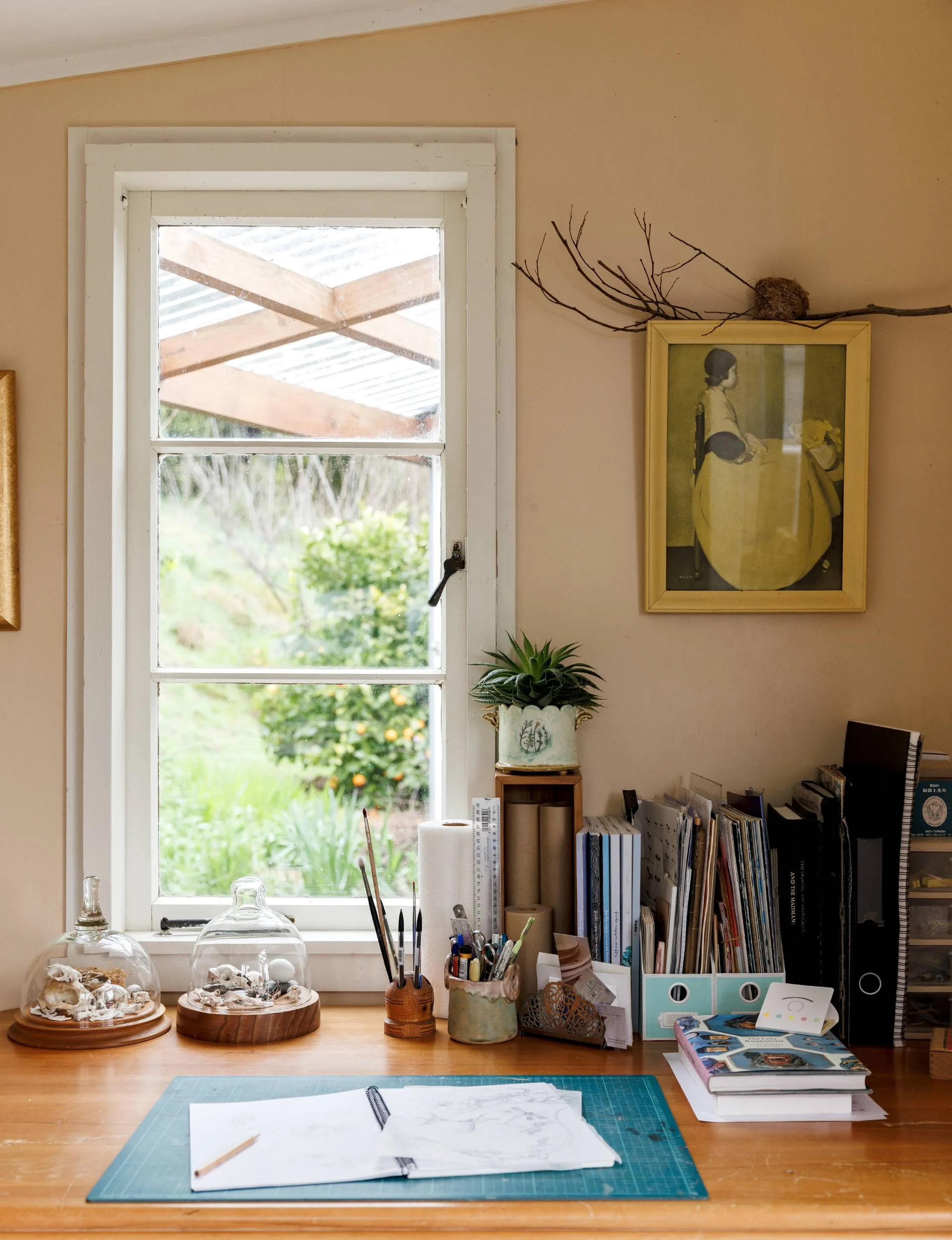 I love my workshop space, tucked away in an orchard in the Te Pahu hills. I especially love that it was built entirely by artists and musicians, faithfully following a chapter from an old builders’ construction manual. The first 10sqm pod came together with scrounged doors and windows and shelving made from demolition wood.