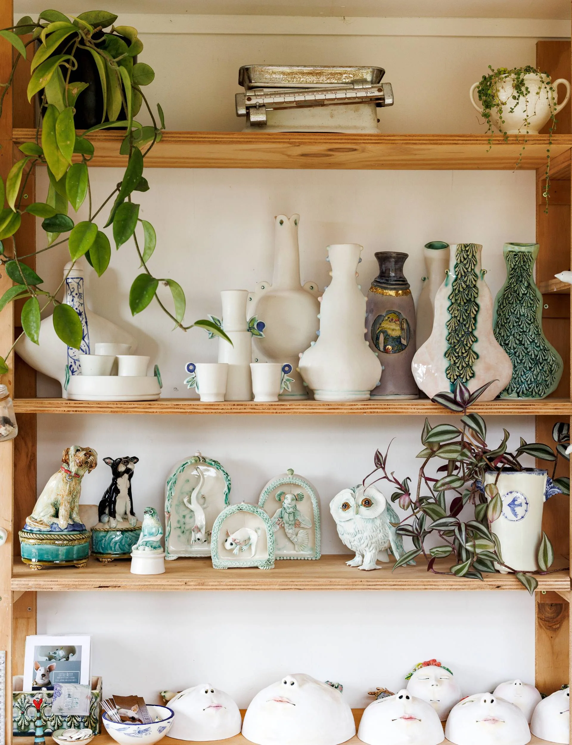 It was a tight squeeze, with me and two large greyhounds in a space where all the processes of making, glazing, finishing, packing and paperwork happened, so the second little pod, added a few years later, made life easier for all of us. We now have a messy room for making and slow-drying pots; a designated glazing spot on the outside deck; a clean room for office work and Jim’s pack-and-despatch; a separate kiln room where the firing happens; and plenty of sunny deck space for dogs to snooze on.