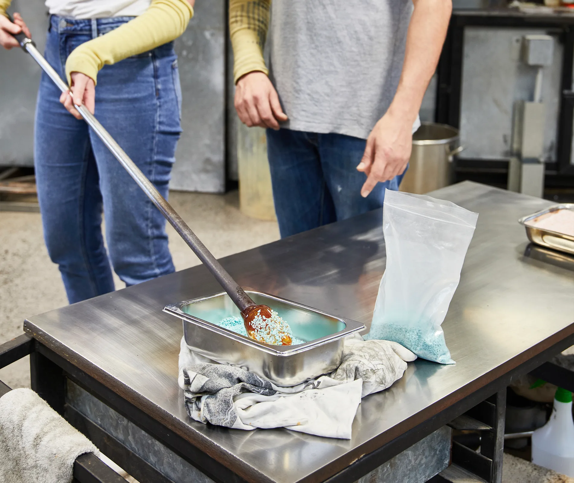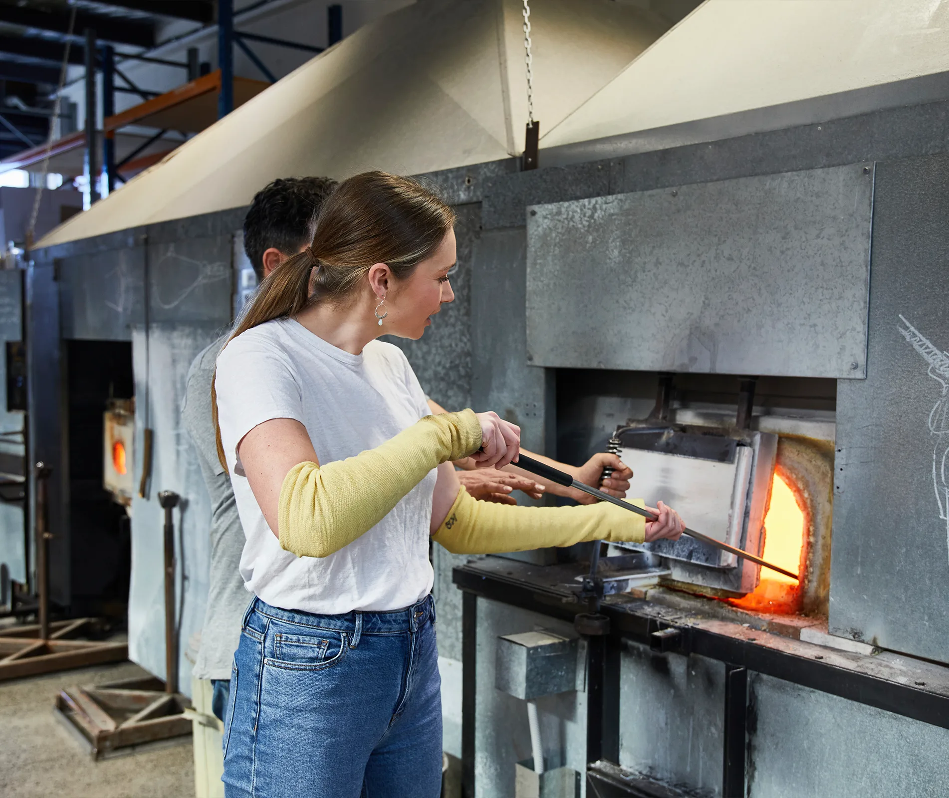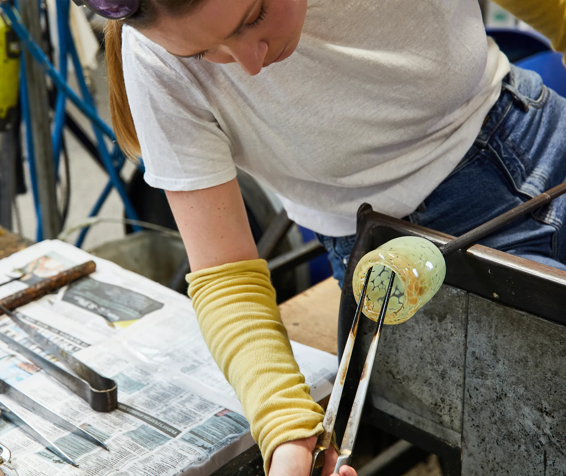 Feeling a bit foolish for considering this the main danger, and not the proximity to 1000-degree furnaces, I gratefully accepted some arm protectors and a snazzy little pair of petrol-station sunglasses as my safety kit.