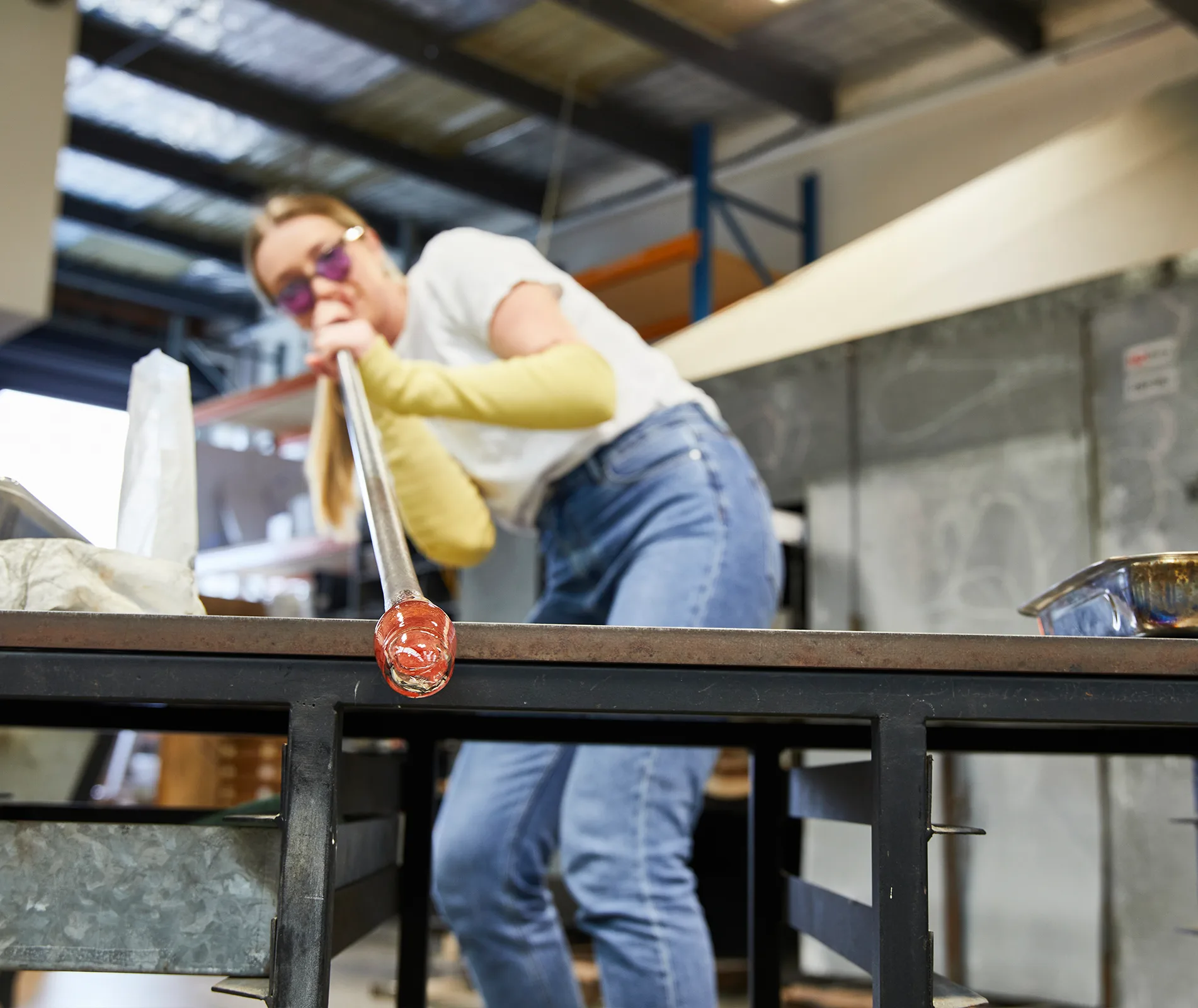 There was one thing I was wary of going into this glass blowing experience – breathing in when I should be blowing out. This of course, I could only assume would result in me inhaling molten glass. I didn’t bring attention to this terrifying vision when Isaac Katzoff and Stephen Bradbourne – the duo behind Monmouth Glass Studios – were showing me around their Henderson workspace. Thankfully, because it soon became obvious that you’d have to have super lungs to suck the thick molten glass up the 1.5m-long metal pipe before it cooled. I, despite practising my ujjayi breath in yoga two times a week, do not have super lungs.