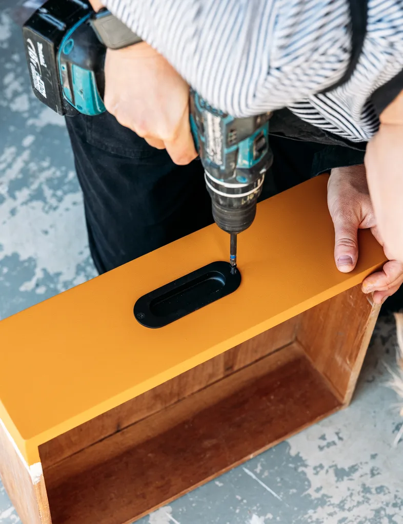 Paint the unit with your Resene paint of choice. I used Resene SpaceCote Low Sheen in Resene Swiss Caramel. For a higher sheen finish use Resene Lustacryl semi-gloss waterborne enamel or, for a chalk finish, Karen Walker Chalk Colour paint from Resene ColorShops. Apply two coats, allowing to dry completely between coats.