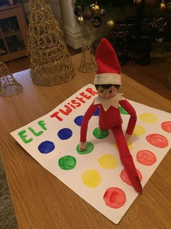 Elf is showing off his flexibility playing Twister