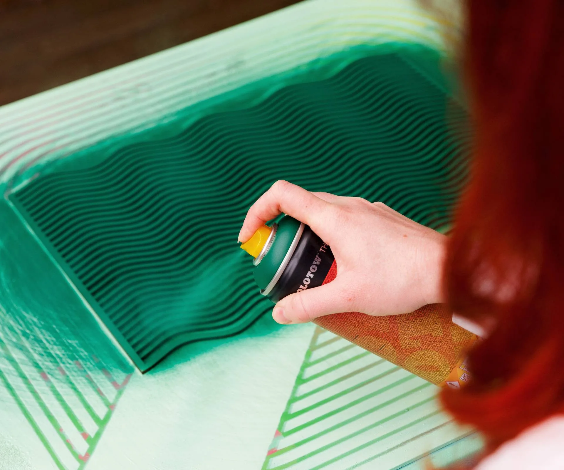 Design, always. With design, I see it as a more structured style of working – I like to call it ‘the boring phase’. It requires a lot of screen time, a lot of math and a lot of failed designs, literally hundreds. Colour comes later in the process – this is where I can be more playful and less intentional. Most of the time I’m scrambling with whatever I have left because there’s a delay with my spray paint order.