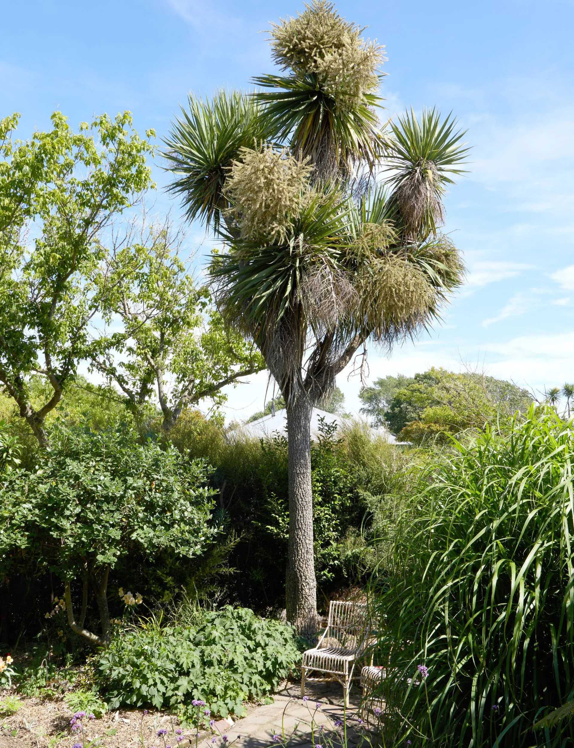Comfortable chairs have been placed in strategic spots, under a cabbage tree. (Credit: Sarah Rowlands.)