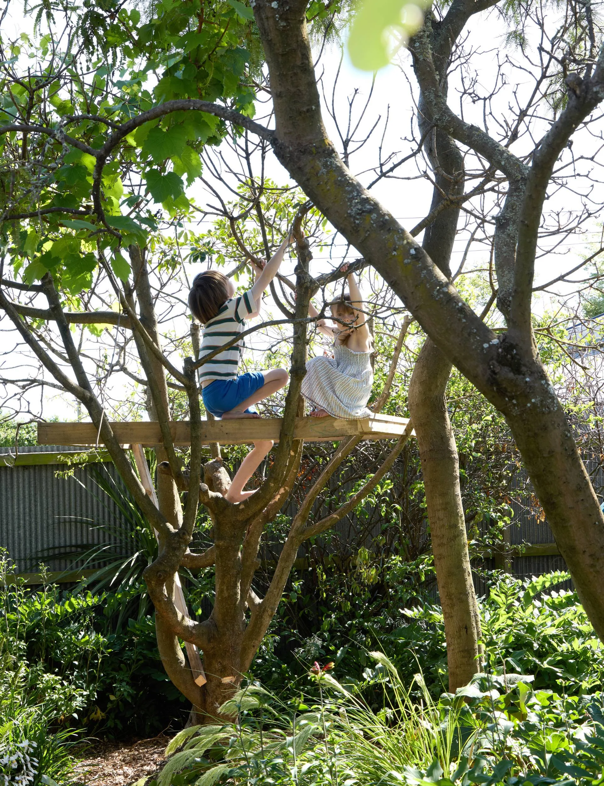 The platform in the tree is a favourite perch for the homeowners’ children, with a grapevine currently being trained to provide shade. (Credit: Sarah Rowlands.)
