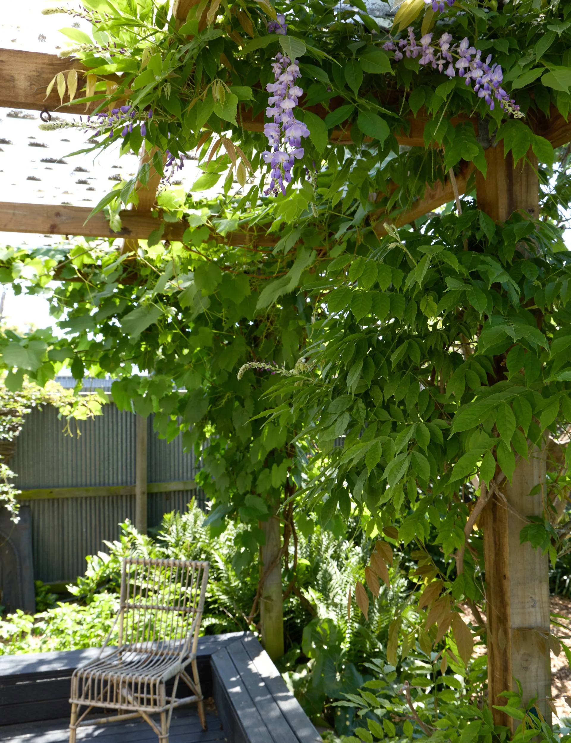 Comfortable chairs have been placed in strategic spots, including the wisteria-covered pergola. (Credit: Sarah Rowlands.)