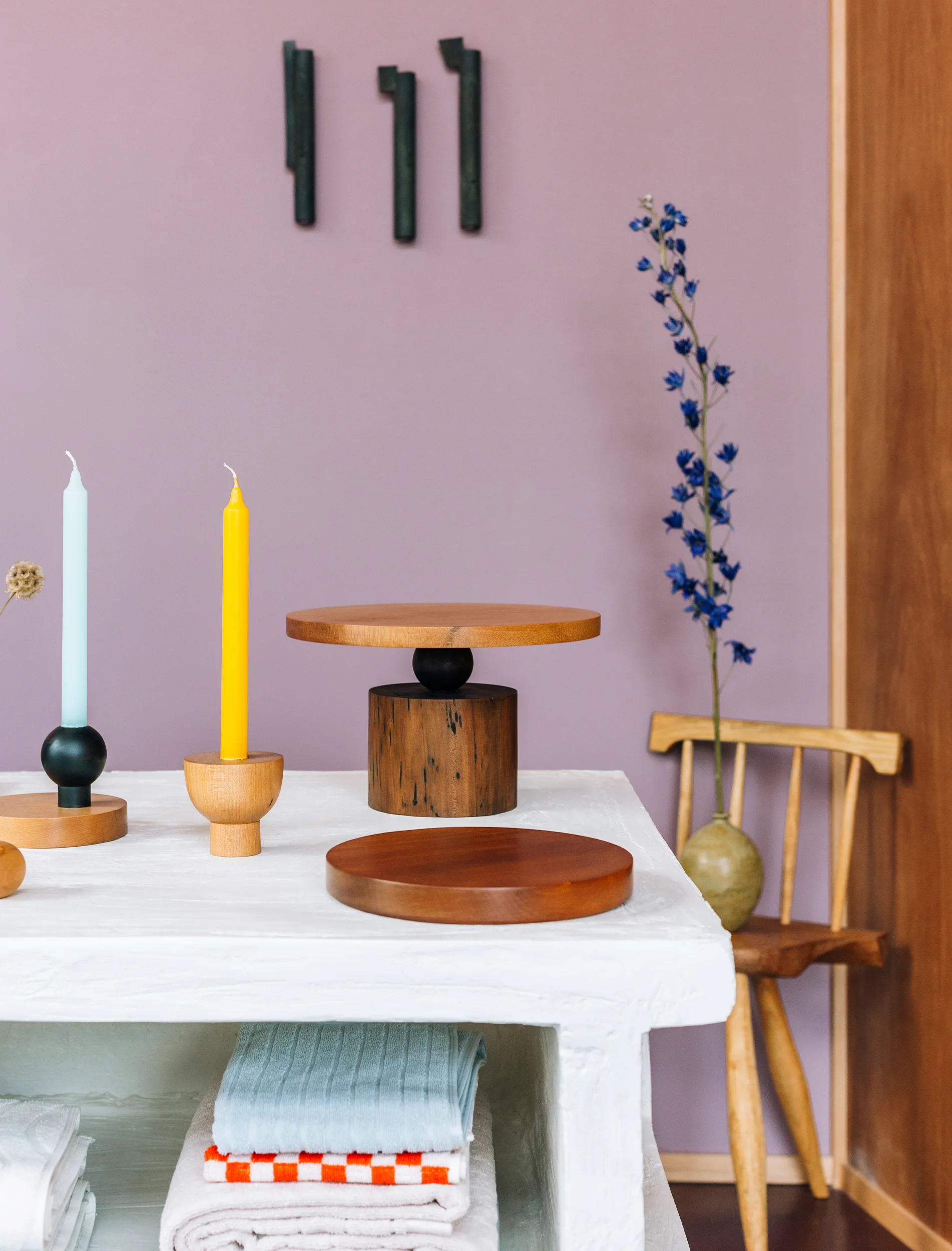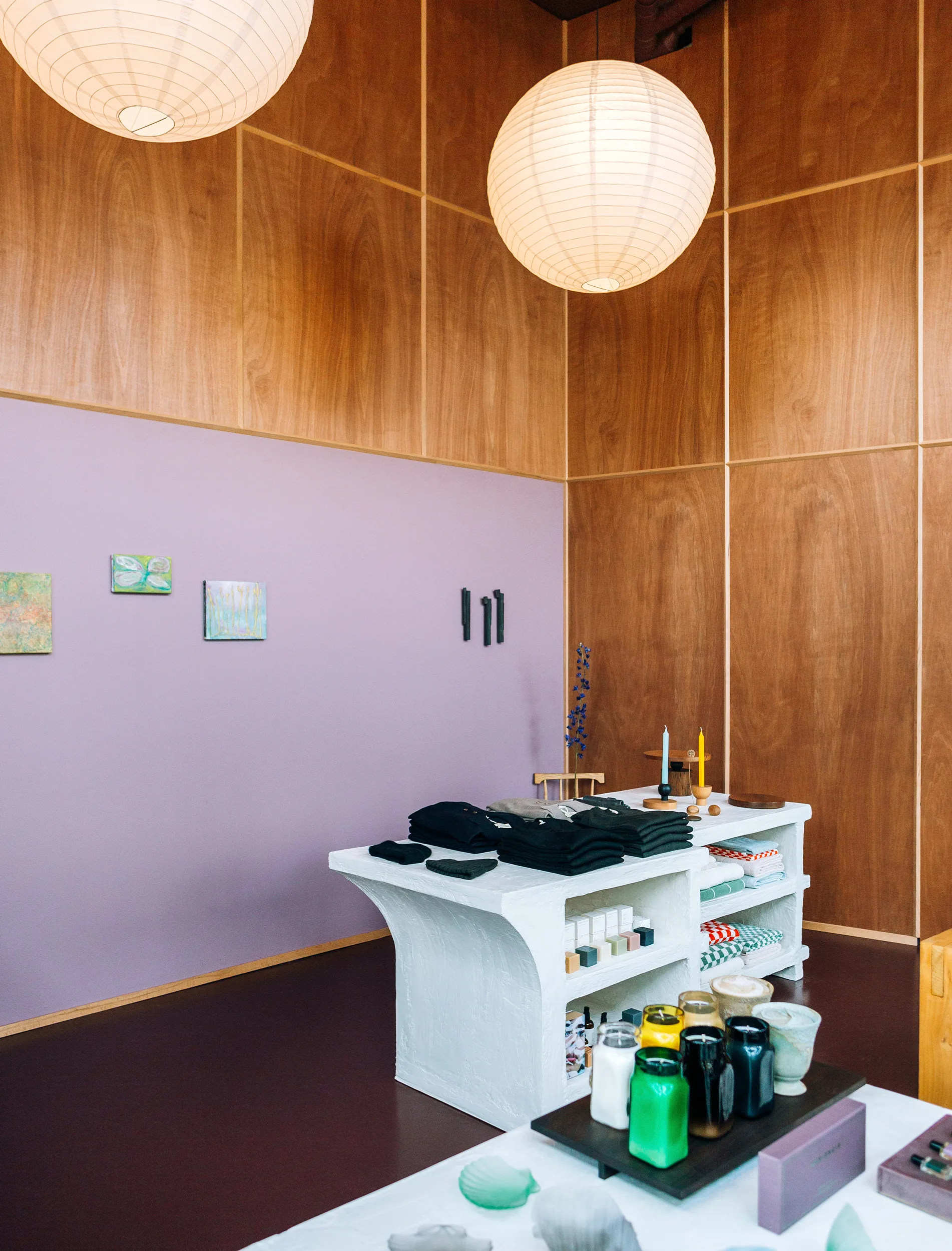 What inspired the choice of the lilac walls and the plaster display cabinets? We knew we didn’t want another white-walled space. So, we started with the colour of the floor; an earth-toned, deep mahogany called Whakapapa. From there we wanted a complementary colour that felt confident. A tone that was warm and soothing to sit in but also a colour that felt like it had a purpose in the space, it didn’t need to be quiet. Mauve was perfect. Our plinths are a commissioned piece from designer Matan Fadida, an incredible young maker based in Tāmaki Makaurau. They are made from polystyrene and plaster, a modular set of three cabinets.
