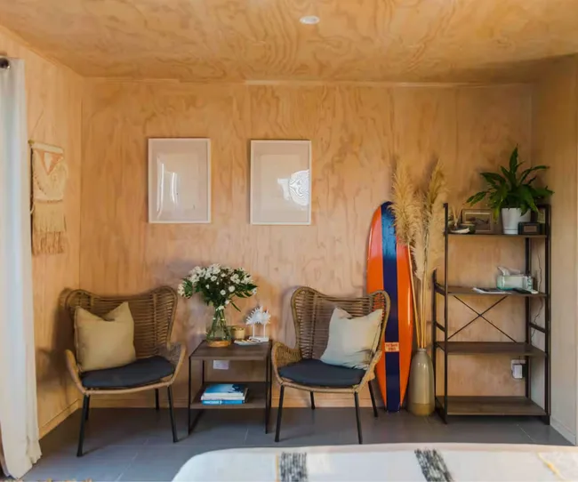 For a stay that captures Mount Maunganui’s laid-back, surfer vibe, look no further than the Shaka Shack. This studio sits on the host’s property but feels completely private, with its own gated entrance and outdoor patio. Plywood walls and rattan furnishings create a relaxed coastal aesthetic, which, alongside the smell of salt in the air, allows you to relax into true holiday mode.