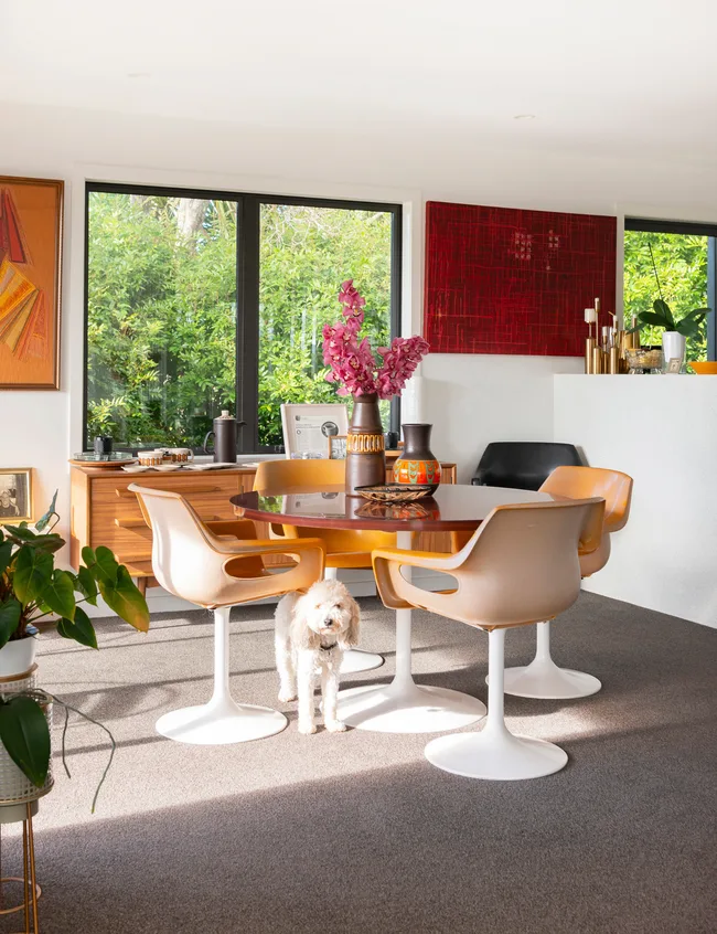 Where does one begin with their vast collection of pop art, collectibles, and quirky gems? “Ah, so many we love,” says Rachel. Among her favourites are a pair of green velvet and gold deco bar stools she discovered at a secondhand shop, and a Lipstick mirror by Roger Lecal, which she snapped up on Facebook Marketplace for just $20. Sam scored a Homer Simpson vintage cookie jar—with a talking head—at an op shop during a skateboarding trip. “The lid is broken, but it still talks,” he says, “and we’ll get around to supergluing it back together one day.”