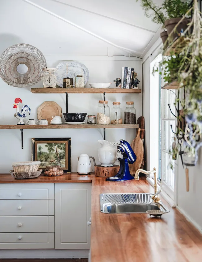 The owner of this charming cottage also runs an online vintage and antique store (@the.workers.cottage, a must visit!), so it’s no surprise that most of the interiors come from second-hand sources. Even the kitchen was thrifted — a pre-loved Shaker-style set found on Facebook Marketplace. Made from maple and MDF, the cabinetry was cleverly reconfigured to suit the new space.