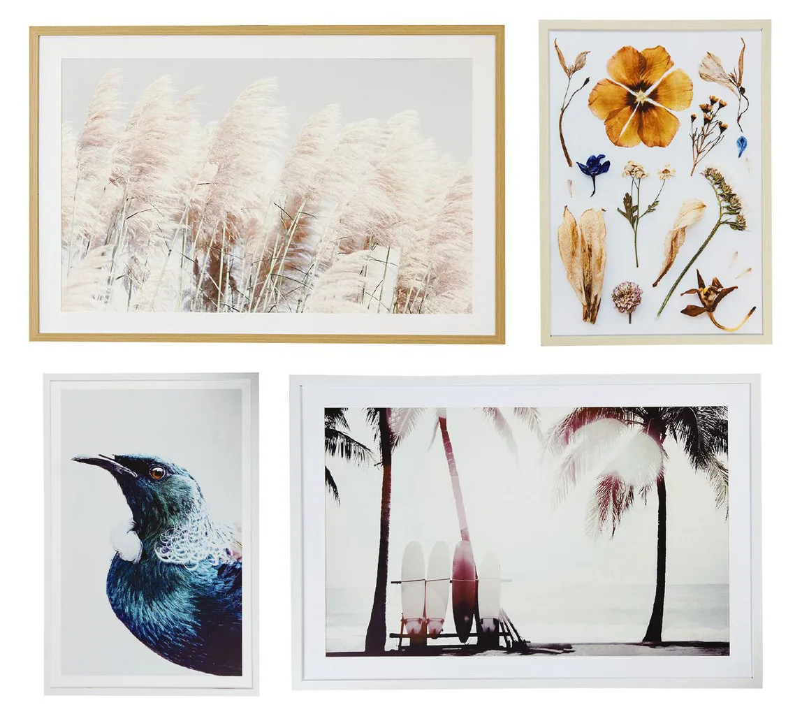 Top (left to right): Living & Co Pampas Grass Framed Print $35, Living & Co Dried Floral Framed Print $29 Bottom (left to right): Living & Co Tui Portrait Framed Print $45, Living & Co Surf and Palm Framed Print, $35