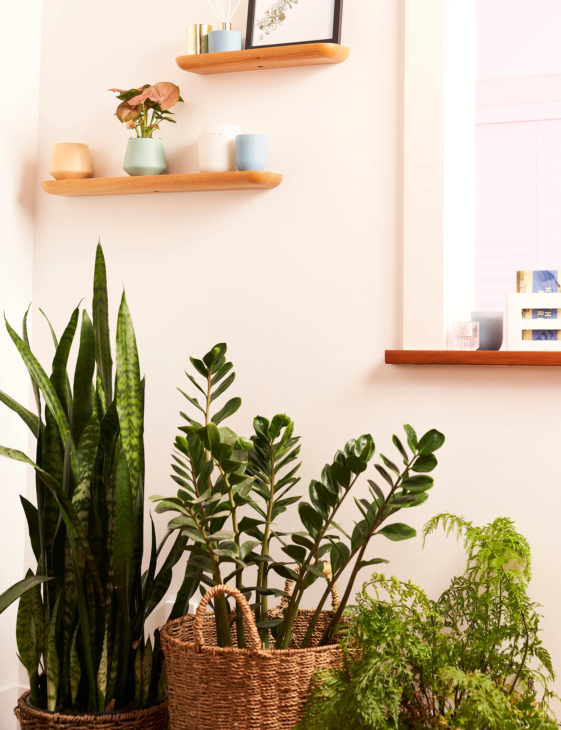 Adding single branches or dried flowers to glass bottles is another interesting way of incorporating nature into a room or consider layering a wall shelf – alternate between hanging and standing plants and add candles or a framed picture for a complete look.