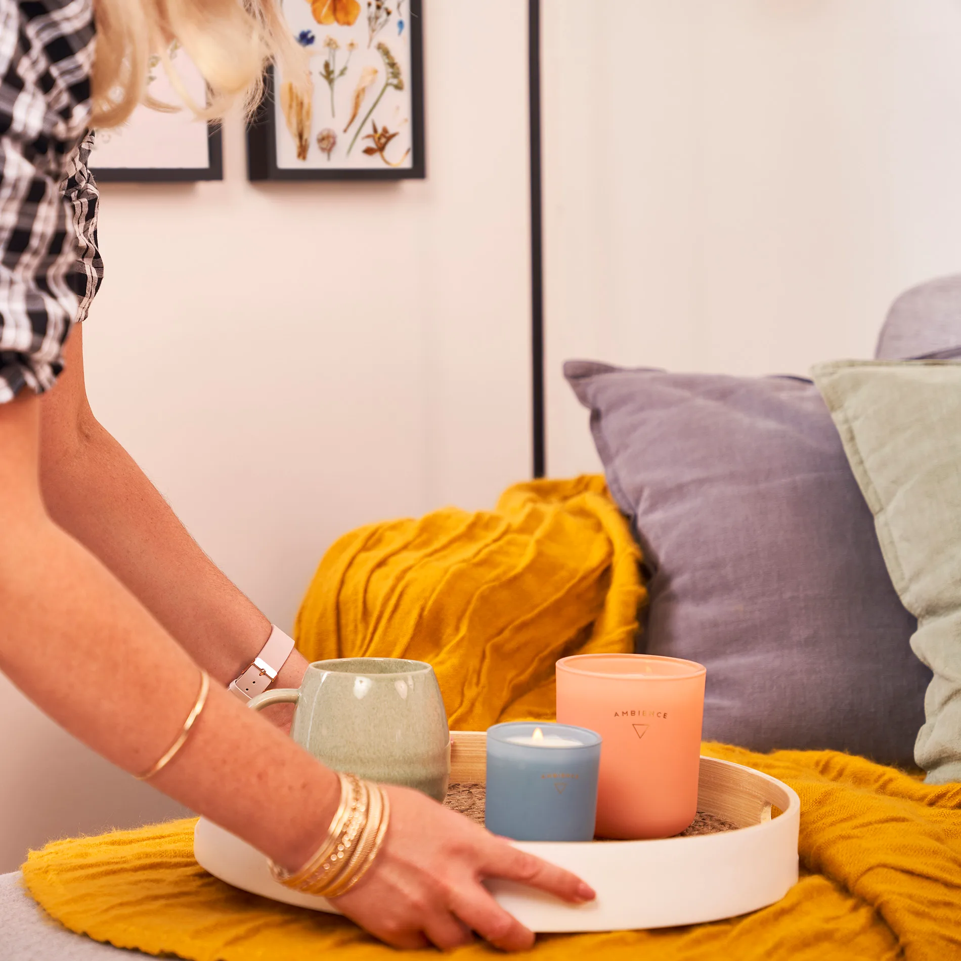 Top (left to right): Living & Co Spun Bamboo Serve Tray $23, Living & Co Crinkle Throw $30, Living & Co Jute Round Placemat $6, Bottom (left to right): Living & Co Ambience Jar Candle Citrus Grove Orange $12, Living & Co Hot Chocolate Mug $6, Living & Co Ambience Jar Candle Waiheke Bay Blue $6