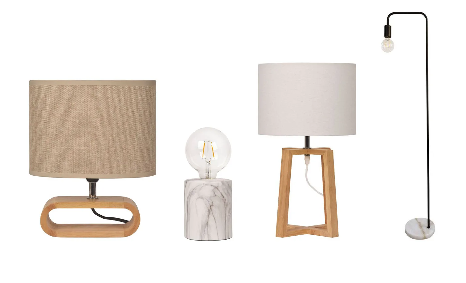 Left to right: Living & Co Enzo Lamp Natural $23, Living & Co Nasiba Lamp Base Marble Look $16, Living & Co Magnus Lamp White $27, Living & Co Marble Base Floor Lamp $39