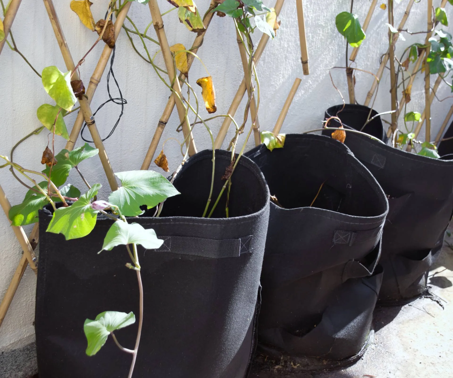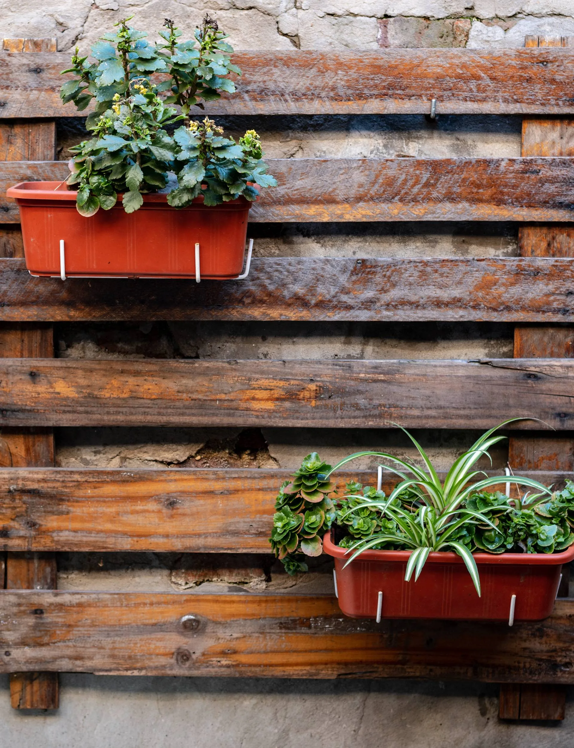 You can also attach pots to walls. Choose from a wide range of vertical wall systems, from rectangular planters with frames that can be hung over rails and fences, to complete vertical growing systems that you fix to a wall. Pallets again provide a free option for creating a wall planter. If you’re looking for a less weighty option, fabric pocket systems are ideal for plants like strawberries, herbs and ferns in shaded areas. Buy purpose-made ones or upcycle an old shoe organiser. You can also create height and raise plants to eye level by placing pots on shelves or stacking them on upturned pots or breeze blocks.