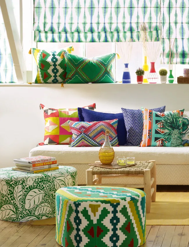 Contrast brightly coloured ethnic prints with natural materials to channel the urban jungle.