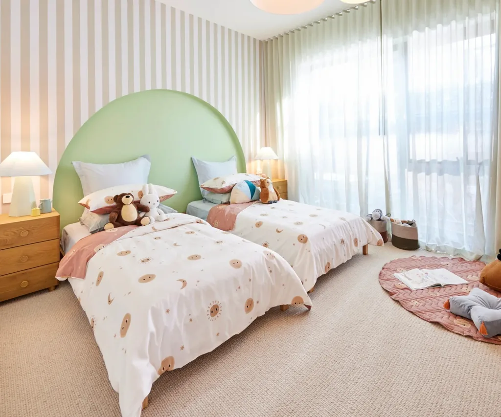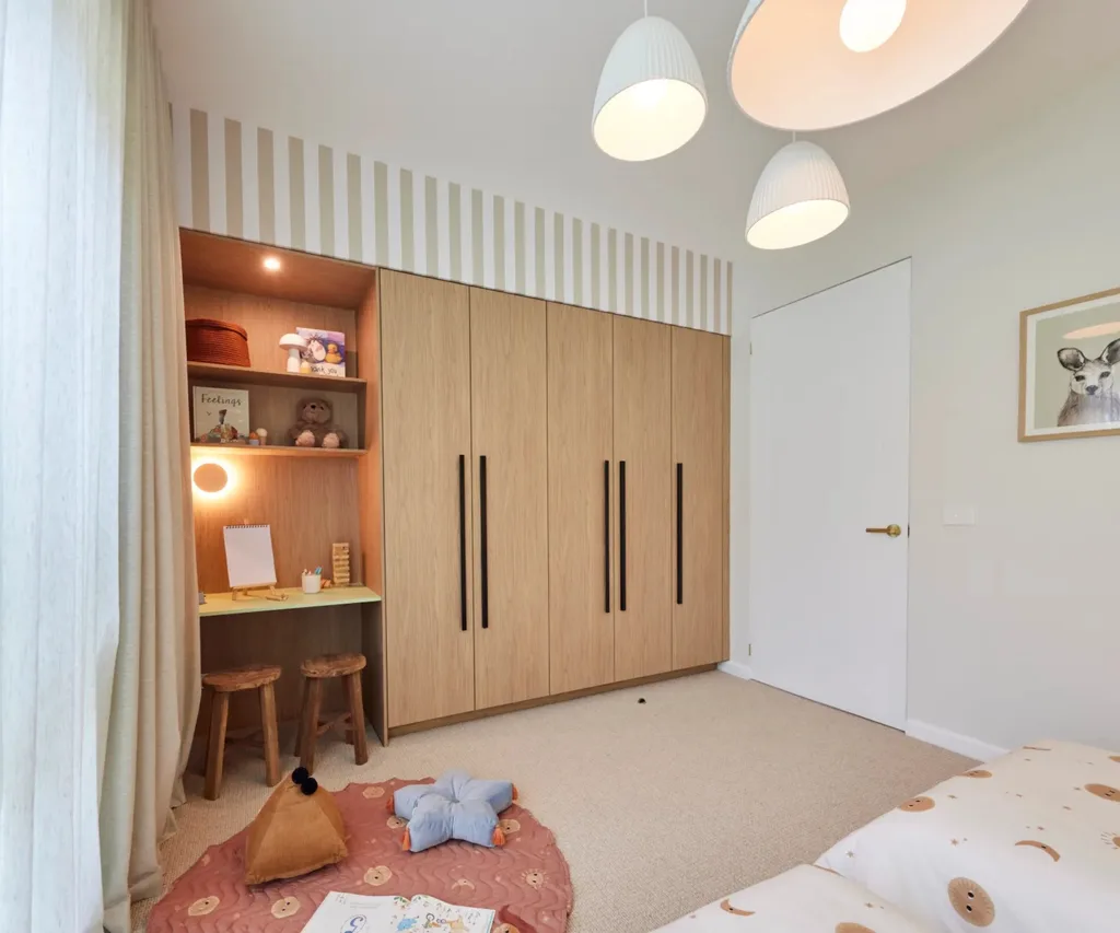 Despite their doubts, Courtney and Grant designed a whimsical and fun space featuring a striped feature wall, cloud-inspired pendant lighting and a statement pistachio green arch detail. Upon entering, the room elicited an excited dance from Shaynna and wide smiles from Darren and Marty.