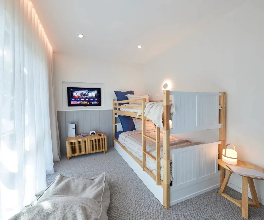 Keeping in line with their “modern coastal, with a touch of Scandinavian” style, Ricky and Haydn designed their space for younger guests, including a statement world map wallpaper, a bunk bed and gaming area. But the process was far from smooth sailing, particularly with a botched plaster job. The boys were certain their chances of winning the week were slim to none.
