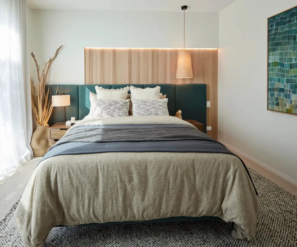 Darren was quick to announce he wasn’t in love with the asymmetry in the green headboard and contrasting timber panelling but had to admit it worked. Shaynna, on the other hand, loved the asymmetry and praised Kristian and Mimi’s inclusion of a variety of textures along with the continuity of the timber panels from last week’s bathroom.