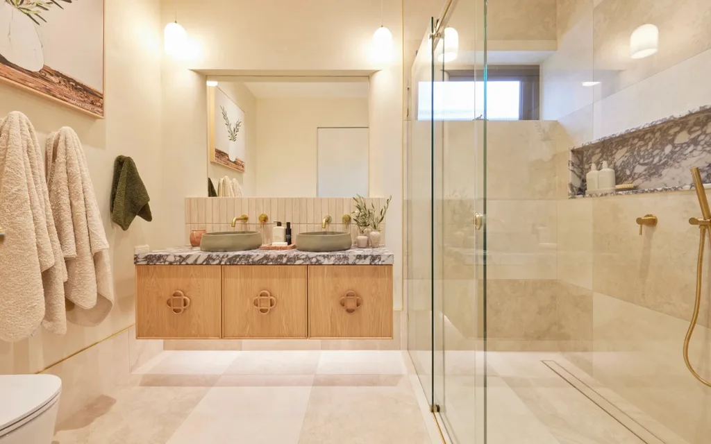 Darren agreed, although he defended their choices particularly the warm colour palette. He loved that this room had all the best aspects of what has been working for them the last few weeks, and commended them for taking the feedback onboard. “I feel, if this a direction creatively that they feel comfortable with, I can see it working if they do it well.” For Marty, it was the practicality he loved, especially the double basin and double showerheads; he raved that they were ticking all the boxes for a potential buyer.