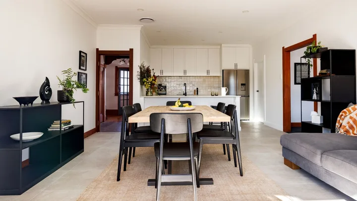 He did have a few pangs of guilt about removing the original rimu joinery, including a bay window in the dining area, but he’s happy with his choice of white PVC joinery with sash bars to replicate the bungalow vibe. “I reckon it makes the whole difference,” he says. “It just keeps the old-school look.”