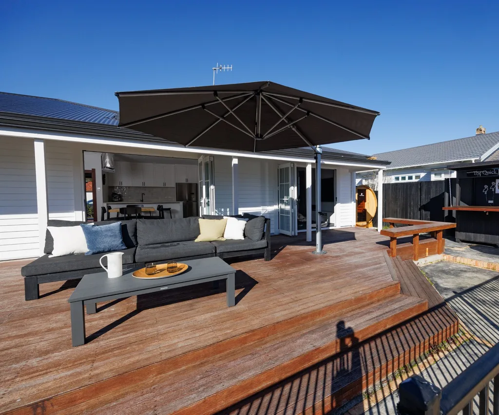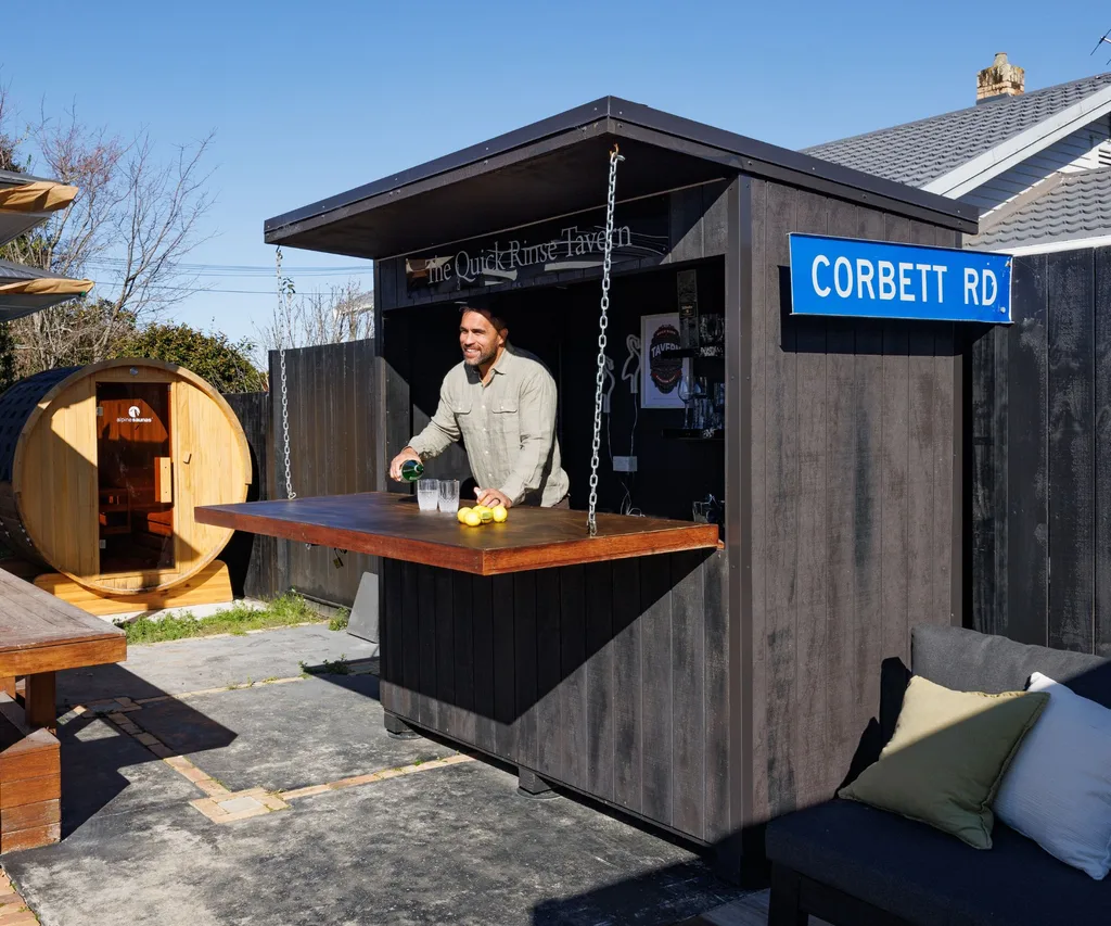 But the most transformational change has probably been the two sets of new bifold doors along the rear wall of the house, which open the dining room and lounge to the north-facing deck, salt-water pool and garden – complete with a sauna and cute outdoor bar they’ve named The Quick Rinse Tavern.