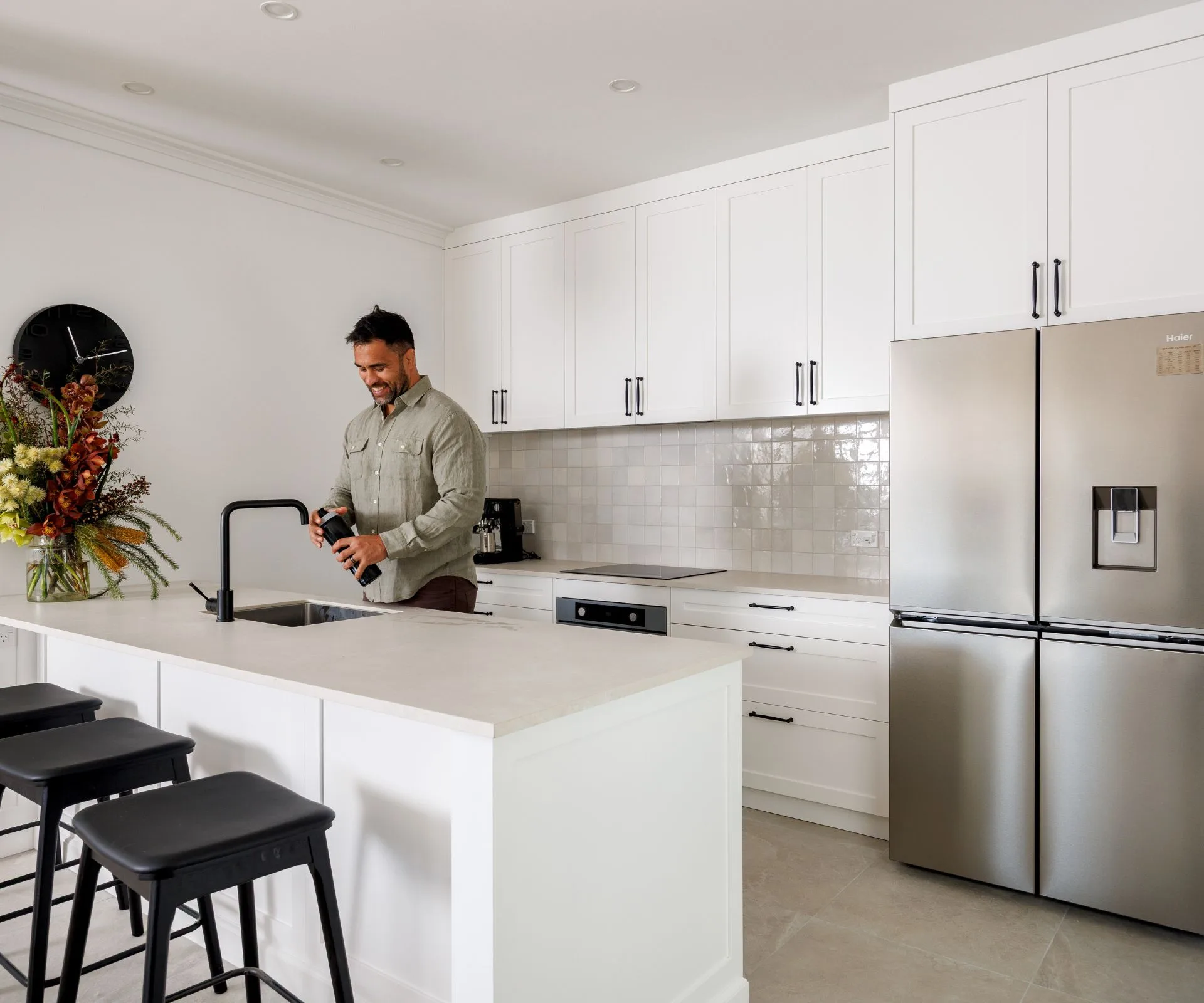 The family is also loving the extra space in the sophisticated, all-white kitchen, which hosts a suite of new Haier appliances, including a built-under dishwasher, built-in oven, induction cooktop, integrated rangehood and quad door fridge-freezer. “We’re pretty time-poor but we get into the kitchen as much as we can and my younger son is really into cooking and baking,” says Liam.