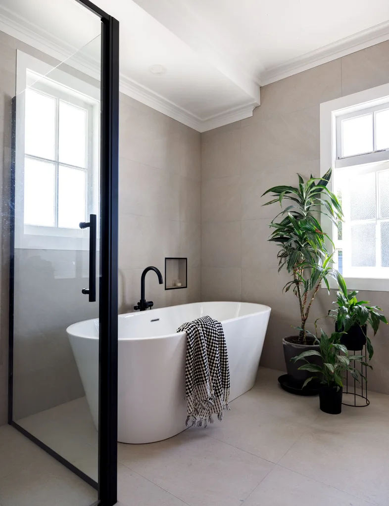 The main bathroom has been completely reconfigured and redecorated, with large-format, sand-toned tiles paired with a freestanding bath and black tapware and fittings for a sharp, modern look. In a nod to the home’s bungalow heritage, the couple have repurposed one of the rimu units from the original bathroom as open shelving in their ensuite.