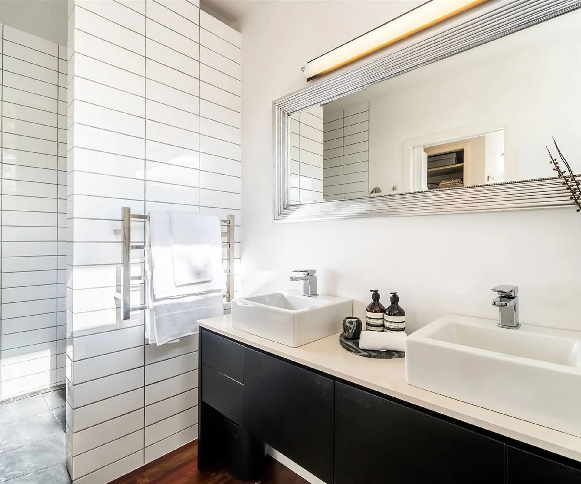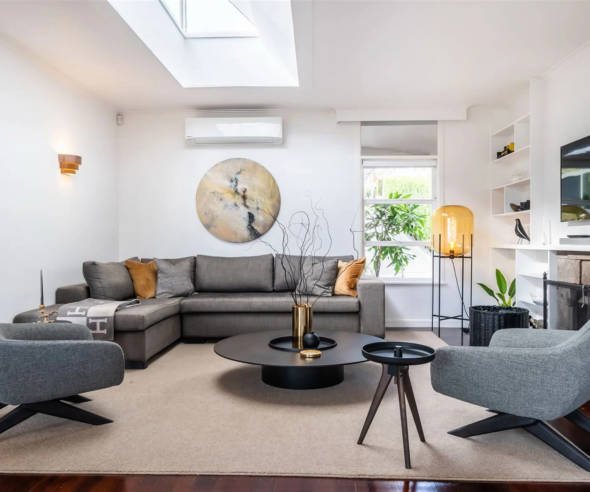 With high-end appliances, the kitchen has a large breakfast island and artistic touches of copper incorporated into its design – seen beneath the island bench and in the negative detailing between drawers. There are three bedrooms located along the hallway, each featuring a deep bay window. Two are serviced by the striking black tiled family bathroom, while the luxurious master has a walk-in wardrobe and ensuite.