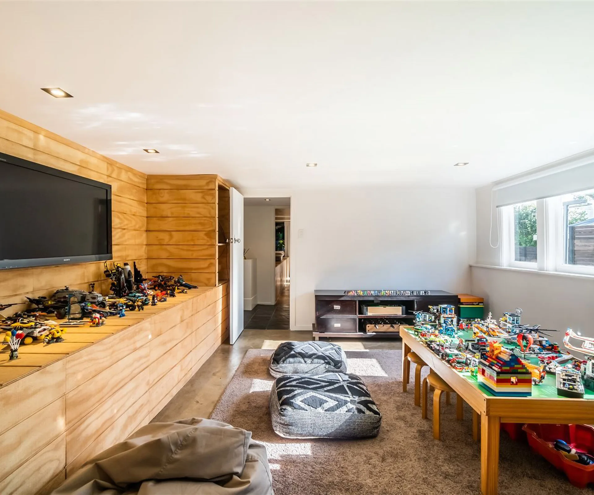 There’s a kids’ rumpus space downstairs, along with an office, with French doors to the garden, a separate laundry and abundant storage.