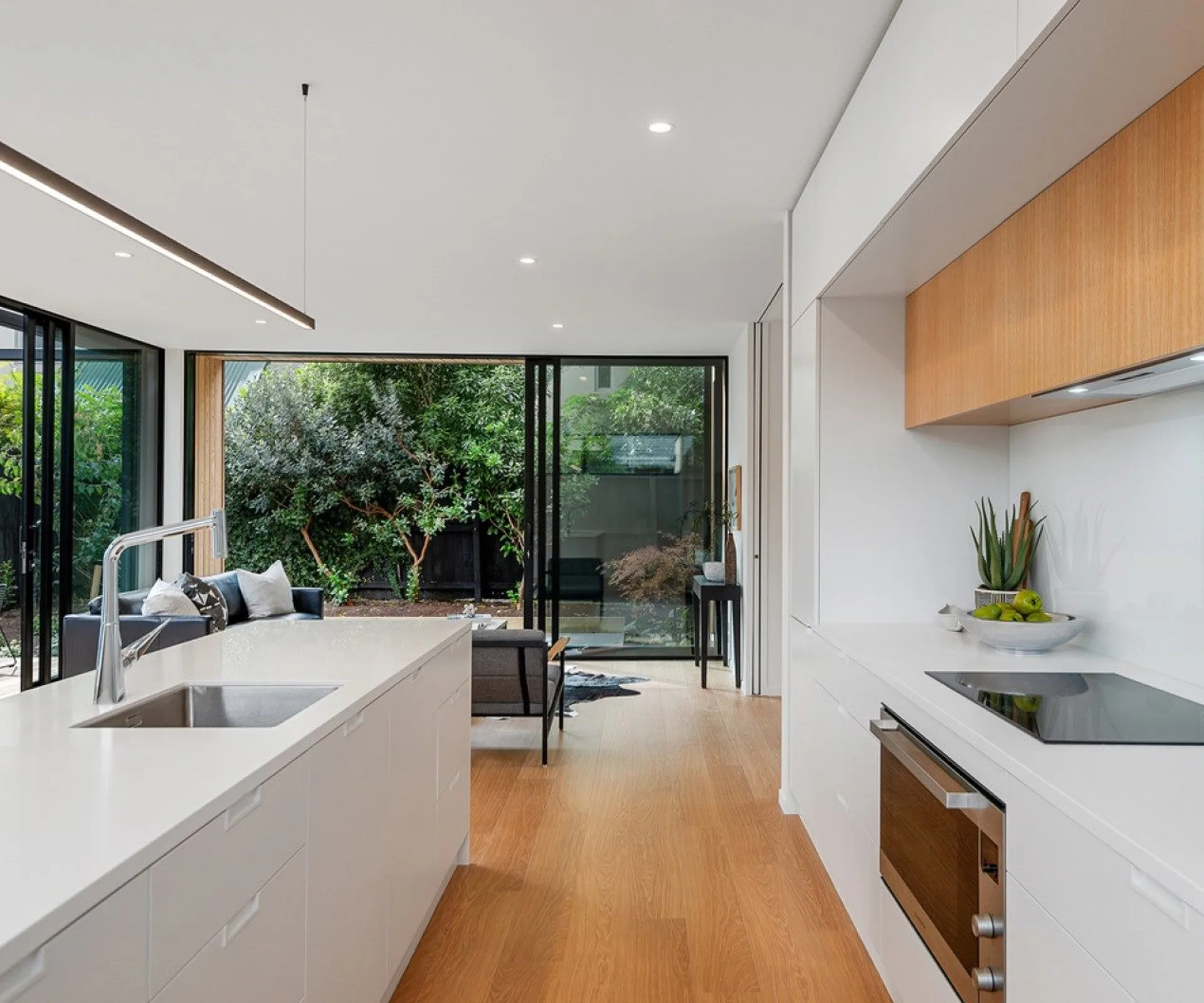 The recently completed new build resides on a private rear section, geared for the sun with multiple gallery windows a feature of the light and open ground floor living, dining and kitchen area. The elegant, well-appointed galley-style kitchen in classic white complements the beautiful engineered oak flooring.