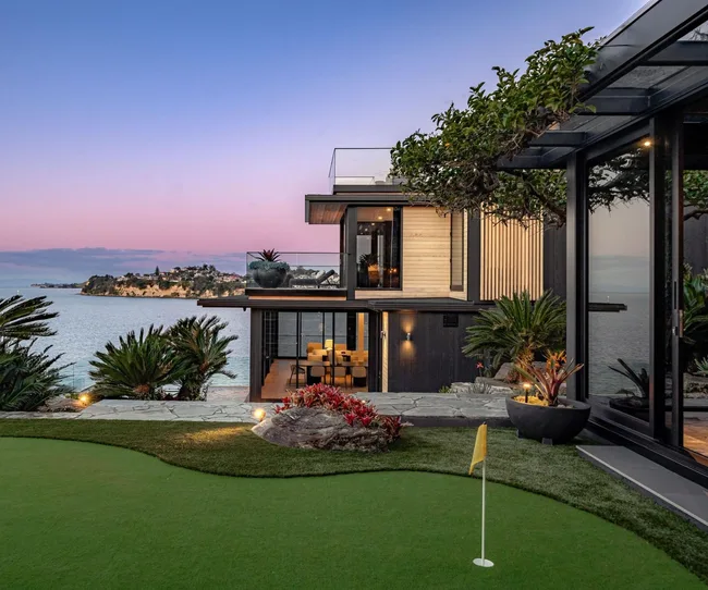 Welcome to paradise, also known as this private one-hectare sanctuary, designed by Glamuzina Architects. This heavenly retreat offers breathtaking views of Matiatia Harbour, Motutapu, the Noises, and even the Auckland mainland, all while blending seamlessly with its natural surroundings.