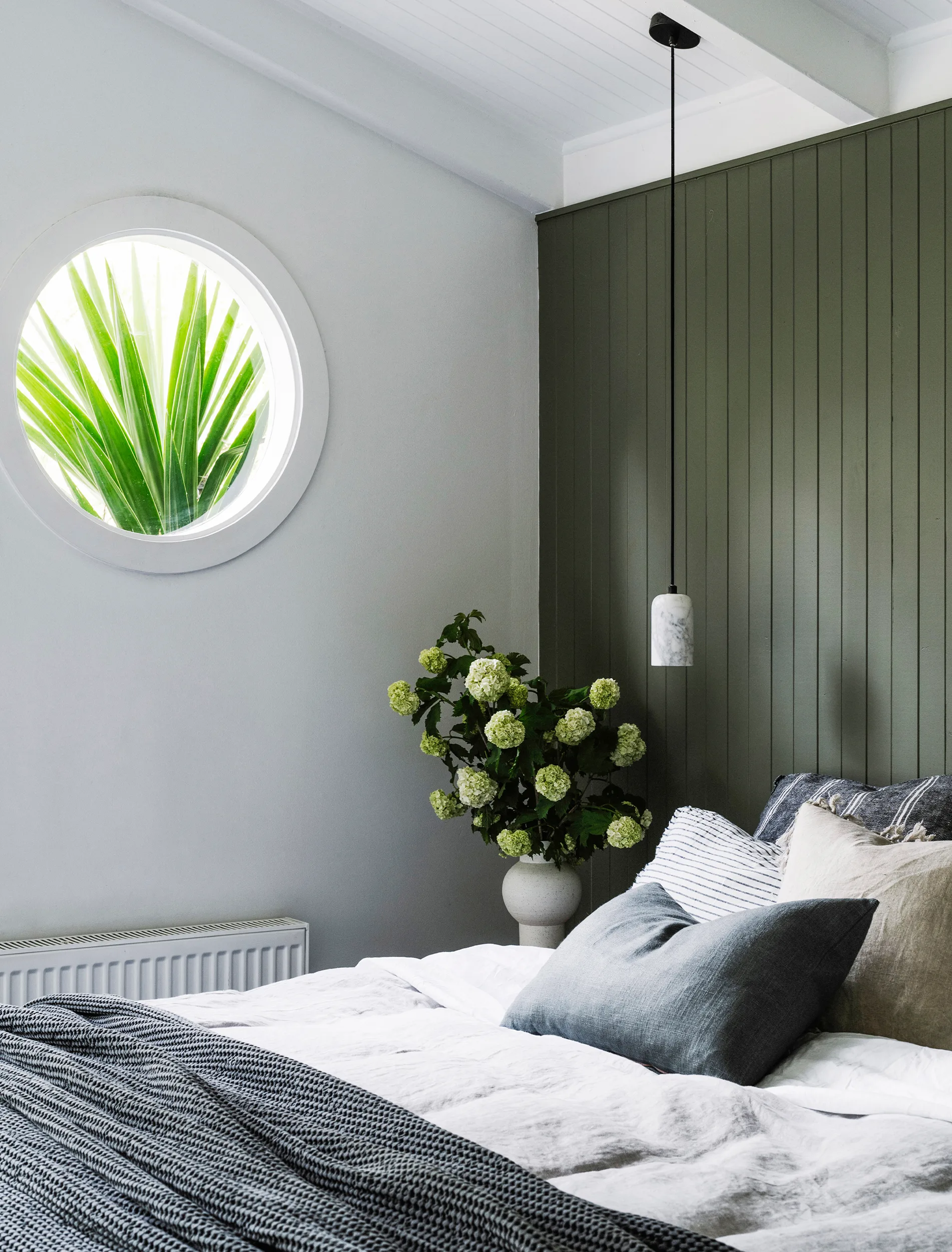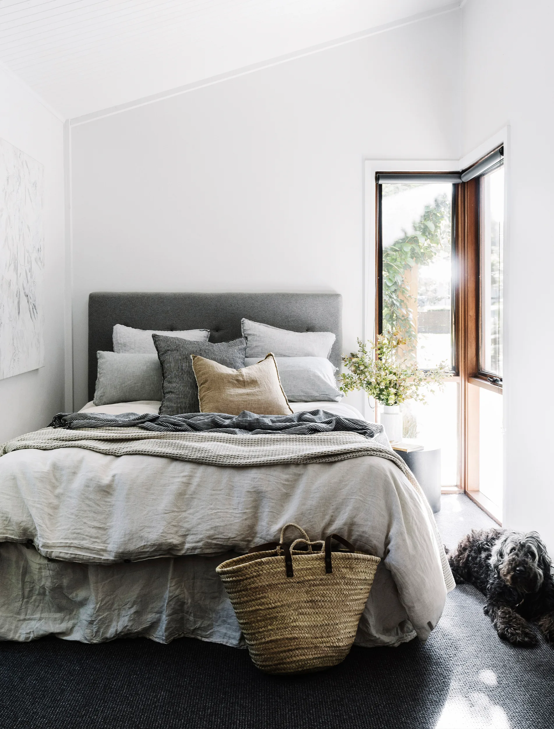 Despite the striking transformation, Jayne and Darren worked entirely within the existing footprint of the house, opting to redesign the layout rather than extend. “What we really loved about the house were the high ceilings, the lining boards, the chunky beams and the cedar windows,” says Jayne – so they kept all those, simply giving everything (except the cedar windows) a fresh coat of white paint. But the kitchen and bathroom had to go, as did the timber-look vinyl floor tiles and the sunrise stained glass, all replaced with materials that fitted what Jayne describes as her “slightly rustic, coastal” aesthetic. “I always stick to a simple, welcoming palette with natural fibres and fabrics,” she says.