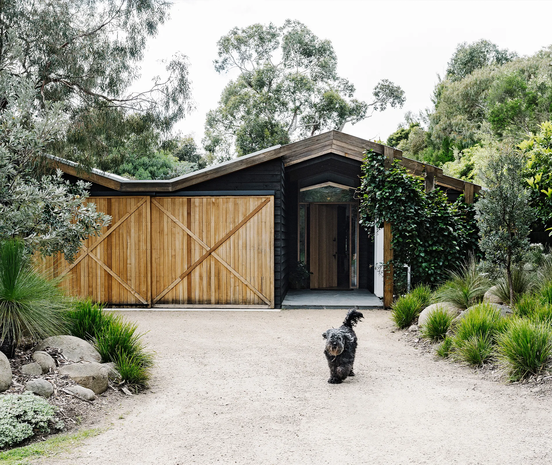 “People who knew the house from before we bought it in 2015 get a bit confused about whether it’s the same house,” says owner Jayne Stewardson. Moving the main entrance from the side to the front – with a dramatic, oversized pivot door – was a key part of the transformation for Jayne and husband Darren. But they didn’t stop there – they also reclad the house in black-stained cedar. And the timber barn door hides a garage, which was originally a carport.